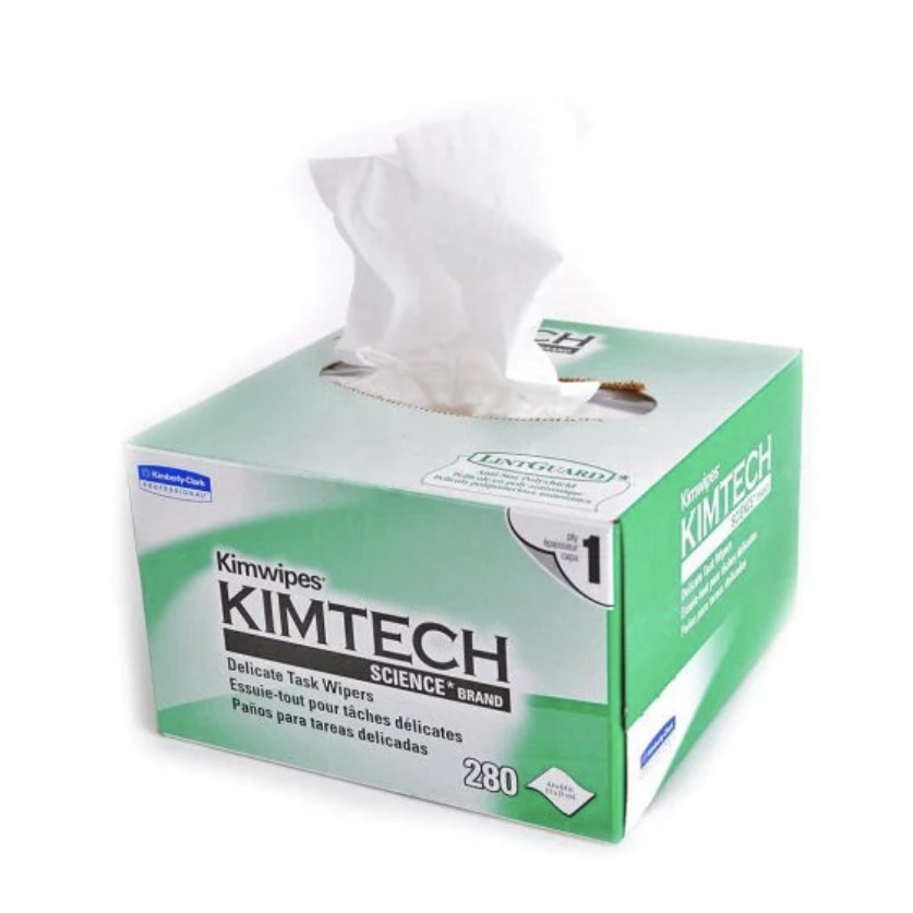 kimwipes has a special tissue for cleaning lens. Better to use a tweezers to hold the tissue than yr hand