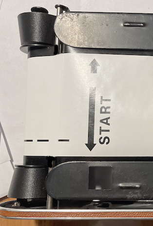 The instructions manual. The film goes on top of the rollers but under the folded metal bars. The lower one has a square cut out for the numbers on the backing paper on the original 122-film. It won't work the same with 120- film, but the green arrow points to the focal plane.