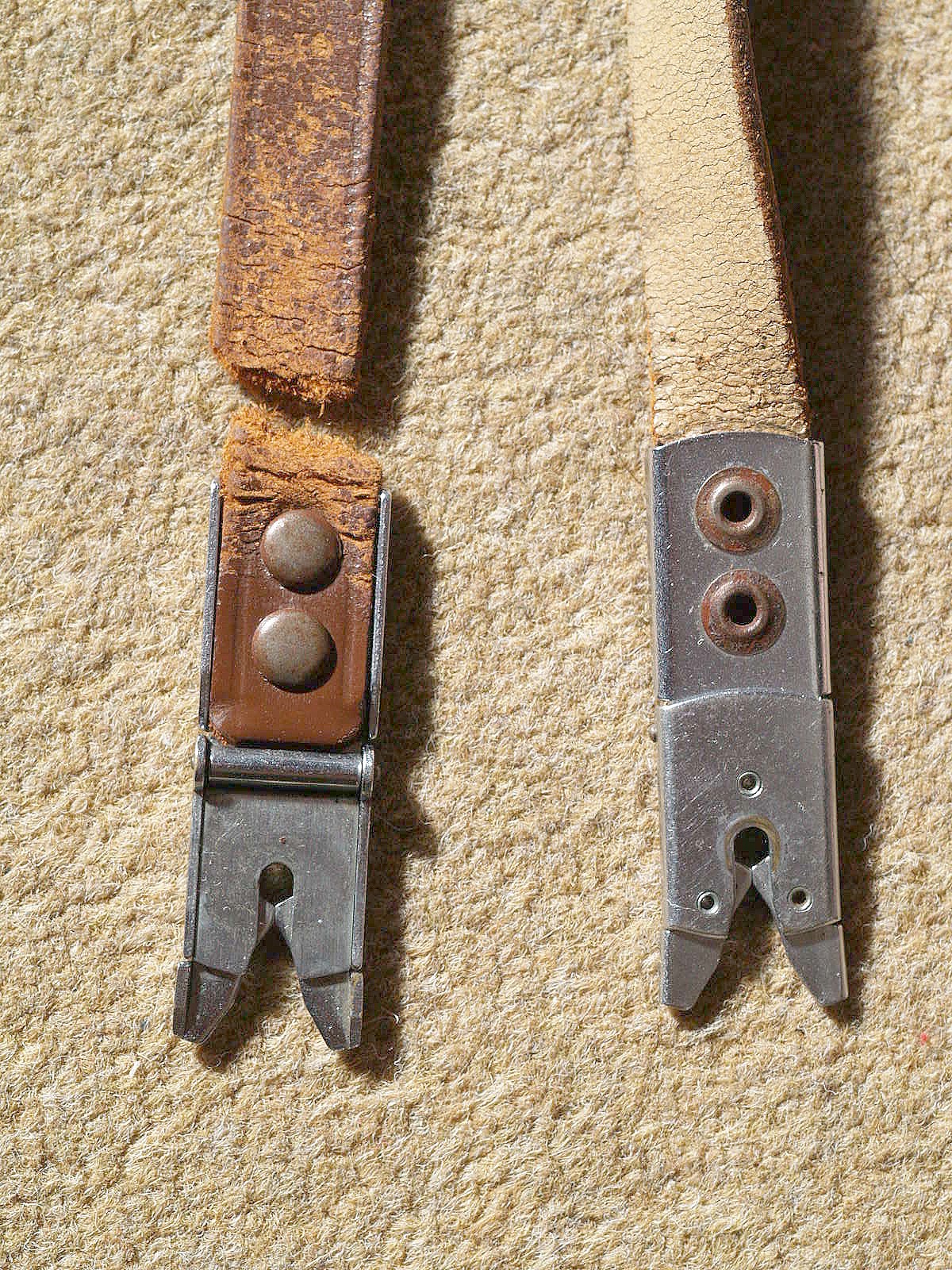 As mentioned, drill out the rivets and don't reuse the old leather. I got a strip of kangaroo hide (thin, strong & flexible) from Australia and built several straps. The only leather straps from the 60s I've had survive are the very fine black leather Leica M straps that were reputed to be from unborn calf hide.