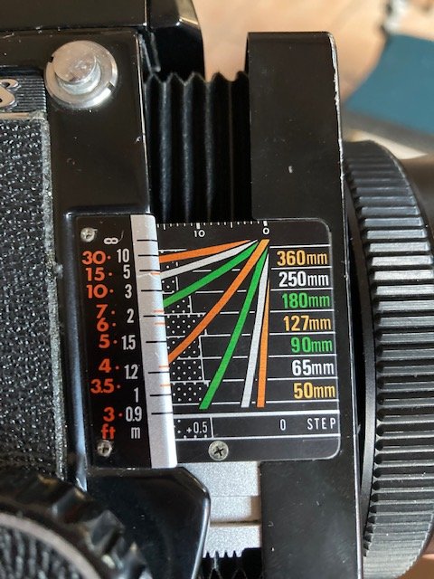 This label/scale was invented by Mamiya marketing deparment to lure you into collecting all the lenses for the system. You know, every time you see this scale, your brain will think "i haven't bought the ____ lens yet... hmmm..."