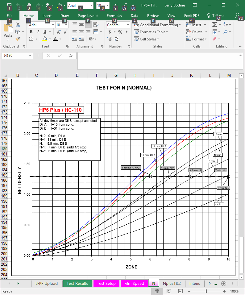 If it's any help, here's a screenshot of my resulting 31-step wedge tray-dev shuffle (6-sheets once through the stack every 30s) for HP5+ in HC-110, 68F/20C. I also have done this with FP4+ in HC-110 if you're interested. Net Density Zero is film-base plus fog. Also note the loss/gain in film speed.