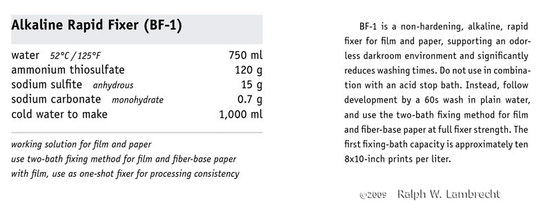 Also, with alkaline or neutral fixes, it is essential to keep the lights off until fixation is complete. Remember that the film or paper is still alkaline and you essentially fog the excess silver halide and then allow the "monobath" fixer to continue to react. I have gotten fog, just by being curious.
