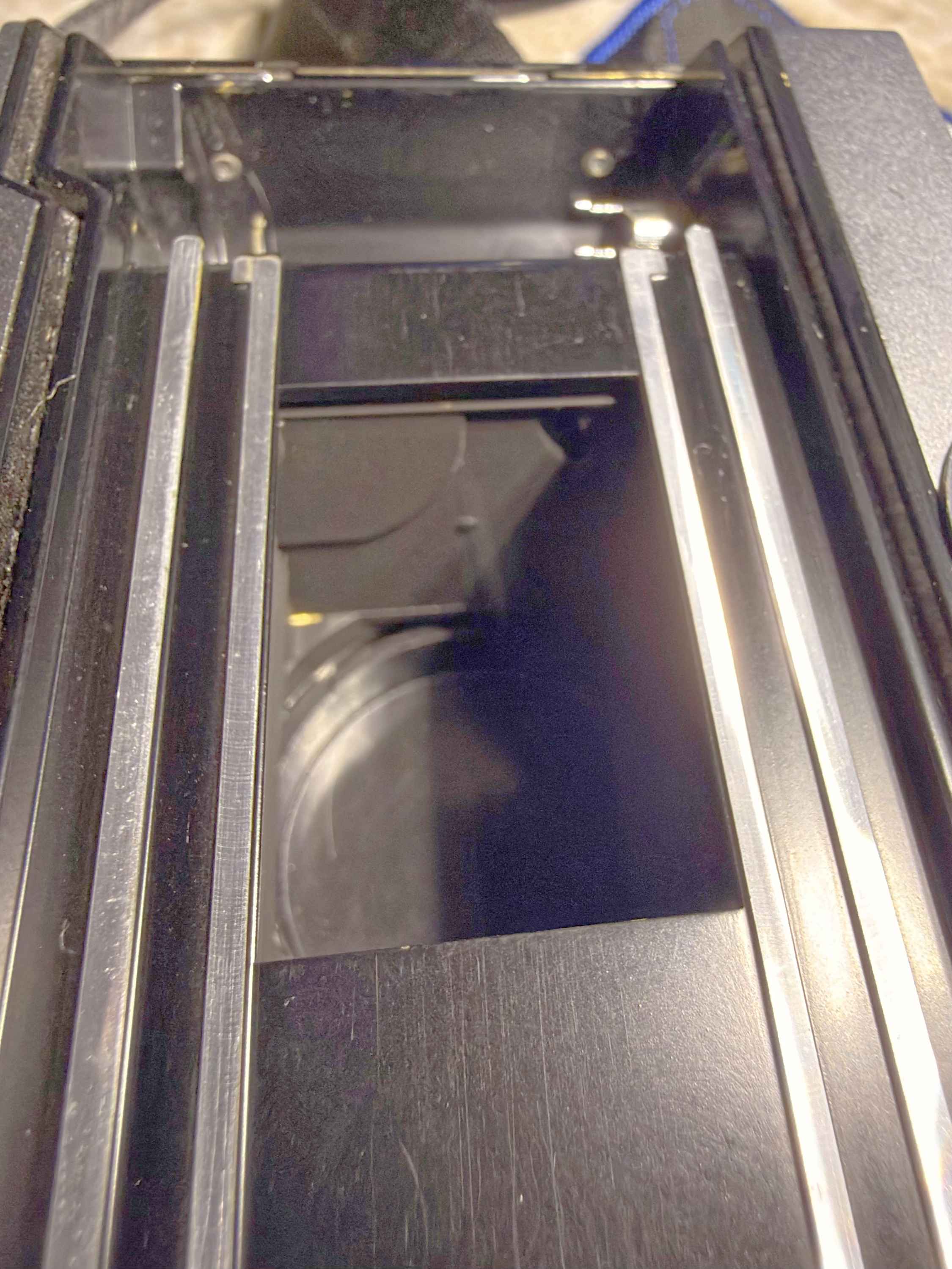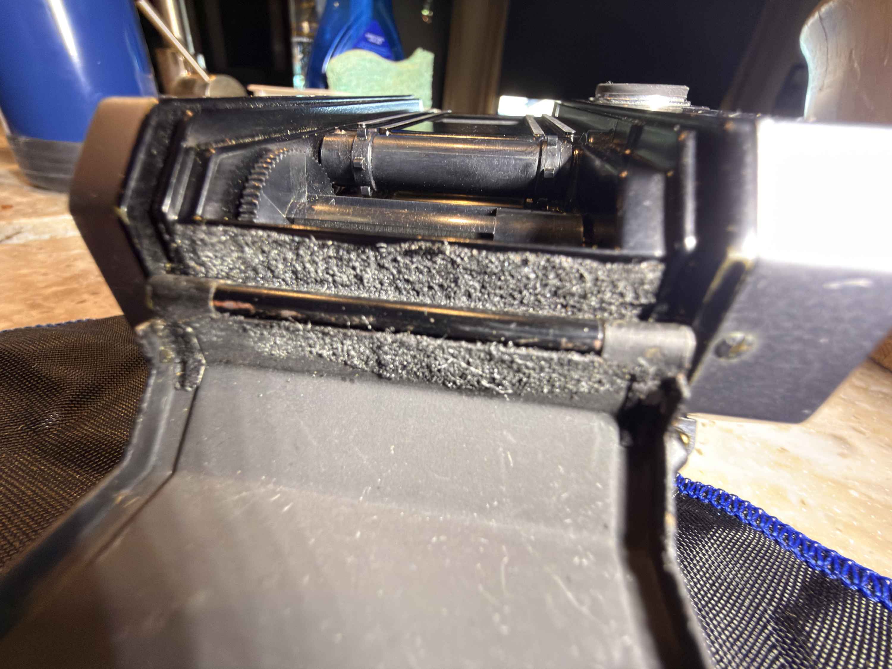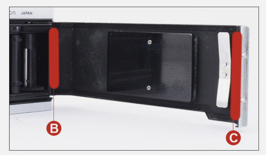 After cleaning the camera to make pictures, I noticed that the back door is completely missing the seal by the roll of film. The seal kit photo shows there are supposed to be seals at both ends of the back door. I made a photo of camera open on B, looking to the end of the camera that I believe is the problem. Nothing appeared to be shiny to my eye.