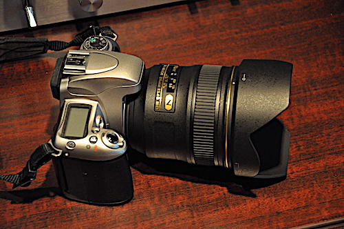 I have the big 650g 24/1.4 on my N55 right now. What a great addition to a massive lens; a light weight body! In fact the combination weighs 5 grams less than the F6 body alone!