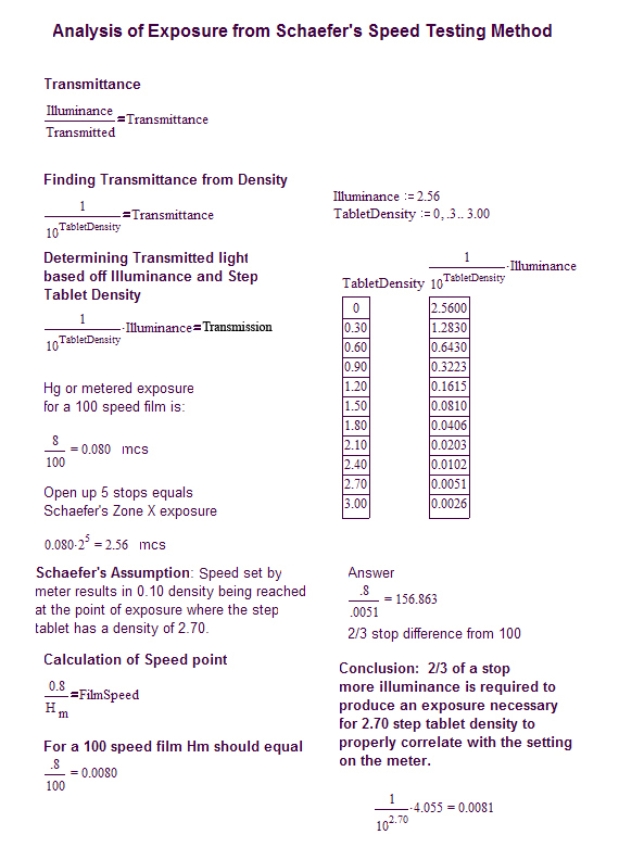 Are you aware Zone System speed testing assumes a different ratio between the metered exposure point and the speed point then the ISO standard? This difference is 2/3 stop. In my opinion, unless you know the exact lxs hitting the film with film speed testing, it's really not worth doing. Why not just ball park it? Following somebody's home brewed testing method (this includes Zone System) will only create a false sense of control. Think about it. There's a 2/3 stop difference in the methodology of the speed testing between the Zone System and ISO standard (or basically how exposure really works), yet people confidently claimed the Zone System testing found the "true" film speed, or that the film manufacturers lied about their results and other such conspiracy theories. The near universal results film speeds 1/2 to 1 stop slower than the ISO rating indicate the potential experimental error in such methods. Actually given all the possibilities for errors, I find the range to be rather tight. Perhaps some of the errors cancel each other out rather than being accumulative.