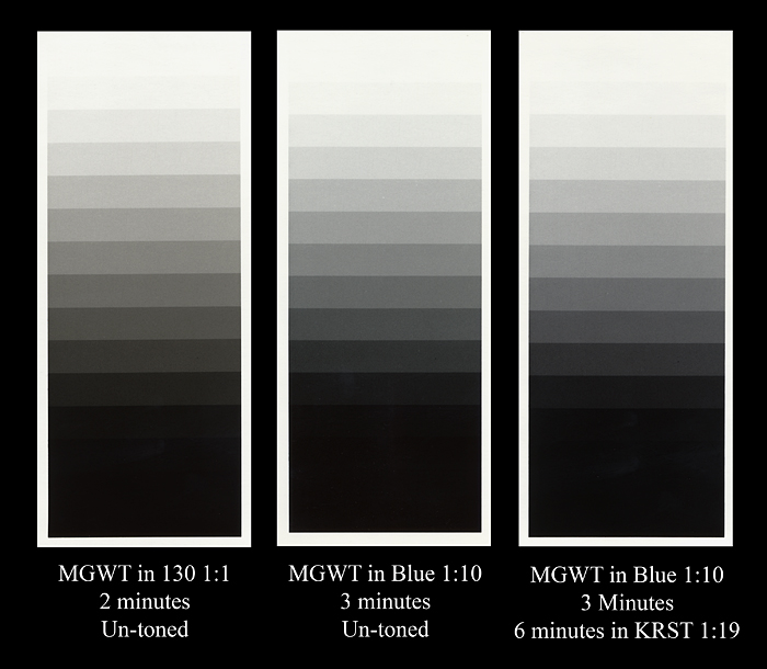 I have attached scans of MGWT in Blue un-toned, as well as MGWT in Blue & selenium toned. I have also included a scan of a wedge of MGWT in PF130 1:1 for comparison in tone.