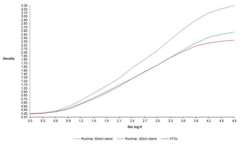 Here are some FP4+ sensitometry results for Rodinal 1:100 stand development at two development times relative to XTOL. Note results will vary in practice as in this experiment care was taken to minimize any difference between developer temperature and ambient temperature.