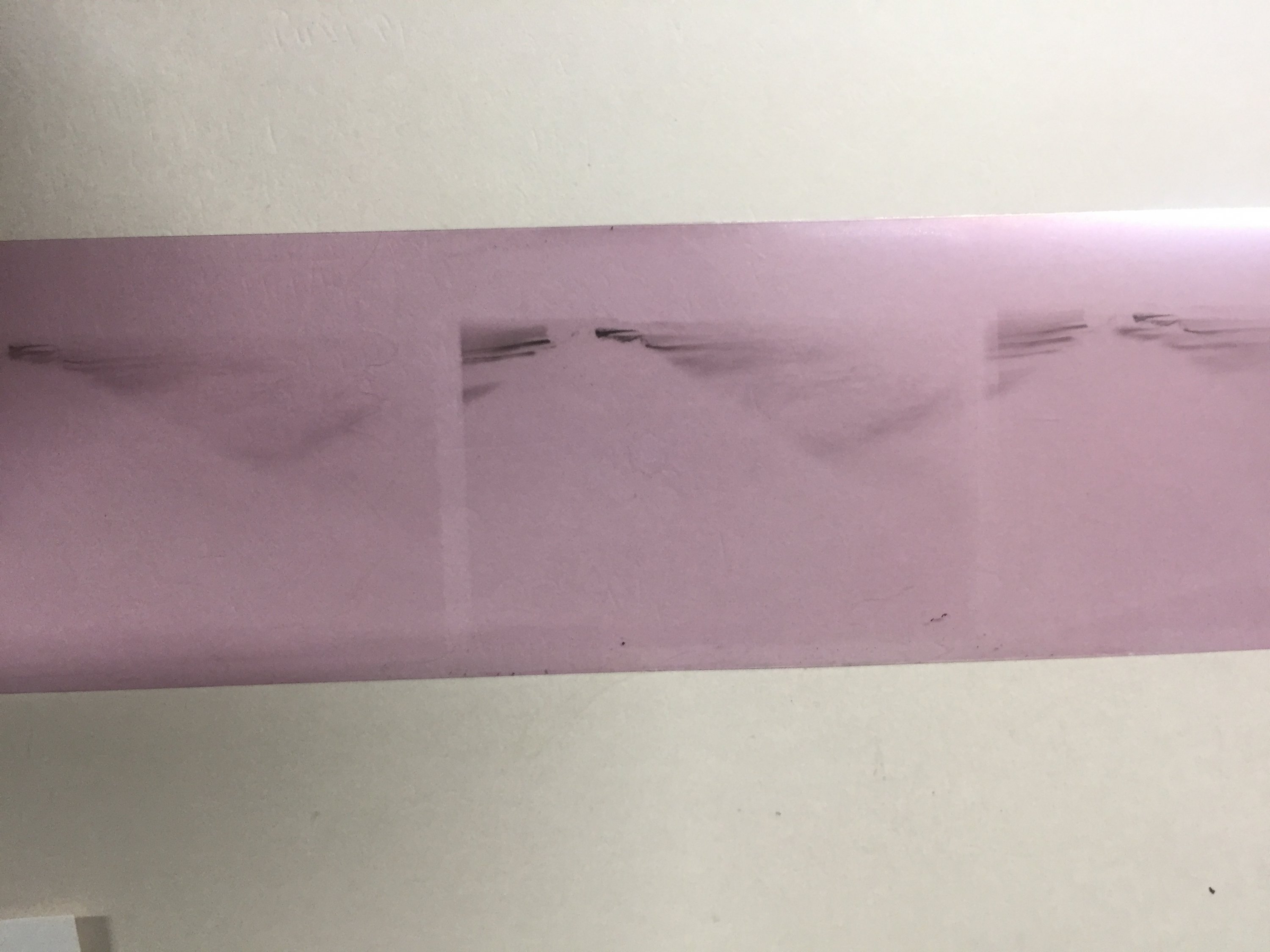 Fast forward to this morning. I had shot a roll last night of a tremendous cloud formation near sunset and was anxious to see the results. Since my last fiasco I had been paying very close attention to my process and had done several rolls without a problem since then. Imagine my surprise when I pulled out a blank or nearly blank roll of film!! (attached). I was dumbfounded. After venting for a while, I decided I had to figure out the problem, I had to recreate it. The developer concentrates were the same I have been using for the last two months. The fixer was the same gallon.