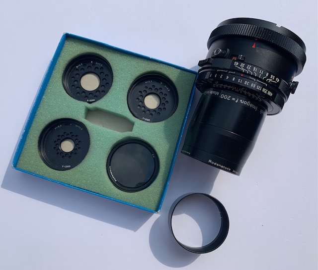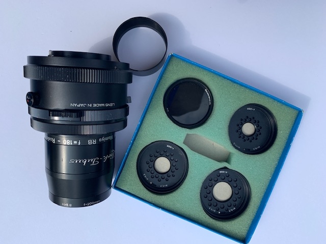 Sold Imagon 200mm in RB67 / RZ67 shutter mount plus 3 strainers, ND 4x and hood