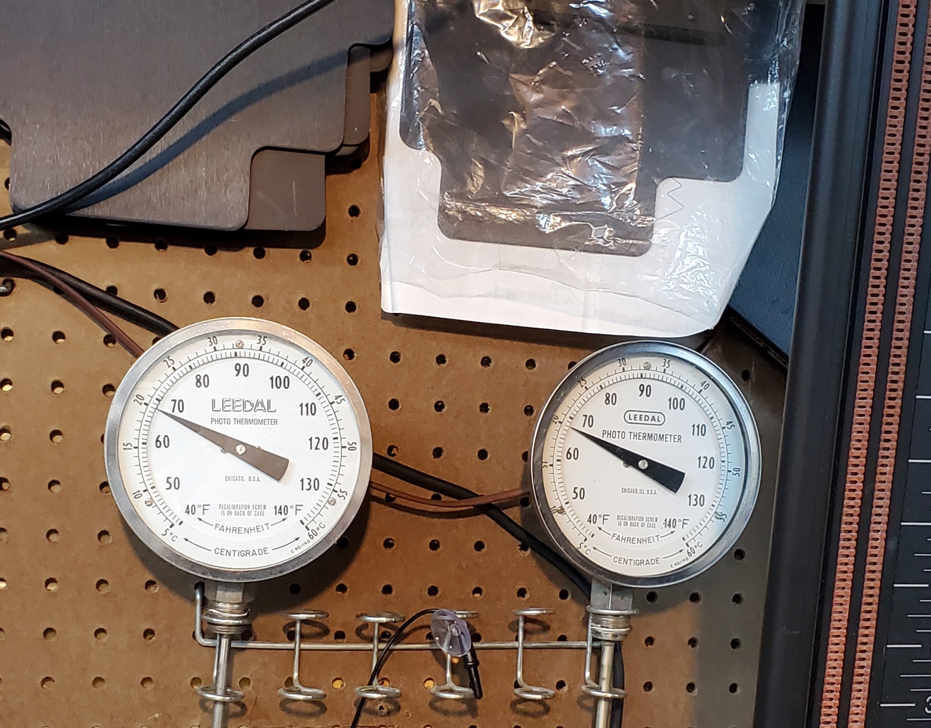 The temperature in the darkroom, with a space heater in it, settles out at 15C. That is not an uncomfortable temp for me. I just put on a second layer of shirt. I use oil heaters because they have no fans and thus don't move around dust. The temperature also varies unpredictably while I am in the darkroom. I had been using a small, very cheap and inefficient aquarium heater but I gave up on it because it was not the type which allowed me to set the exact temp. I discovered, only a few days ago, that there are heaters which allow me to set the temperature. I see that as solving the problem but I will have to try it out, hopefully some time this week.