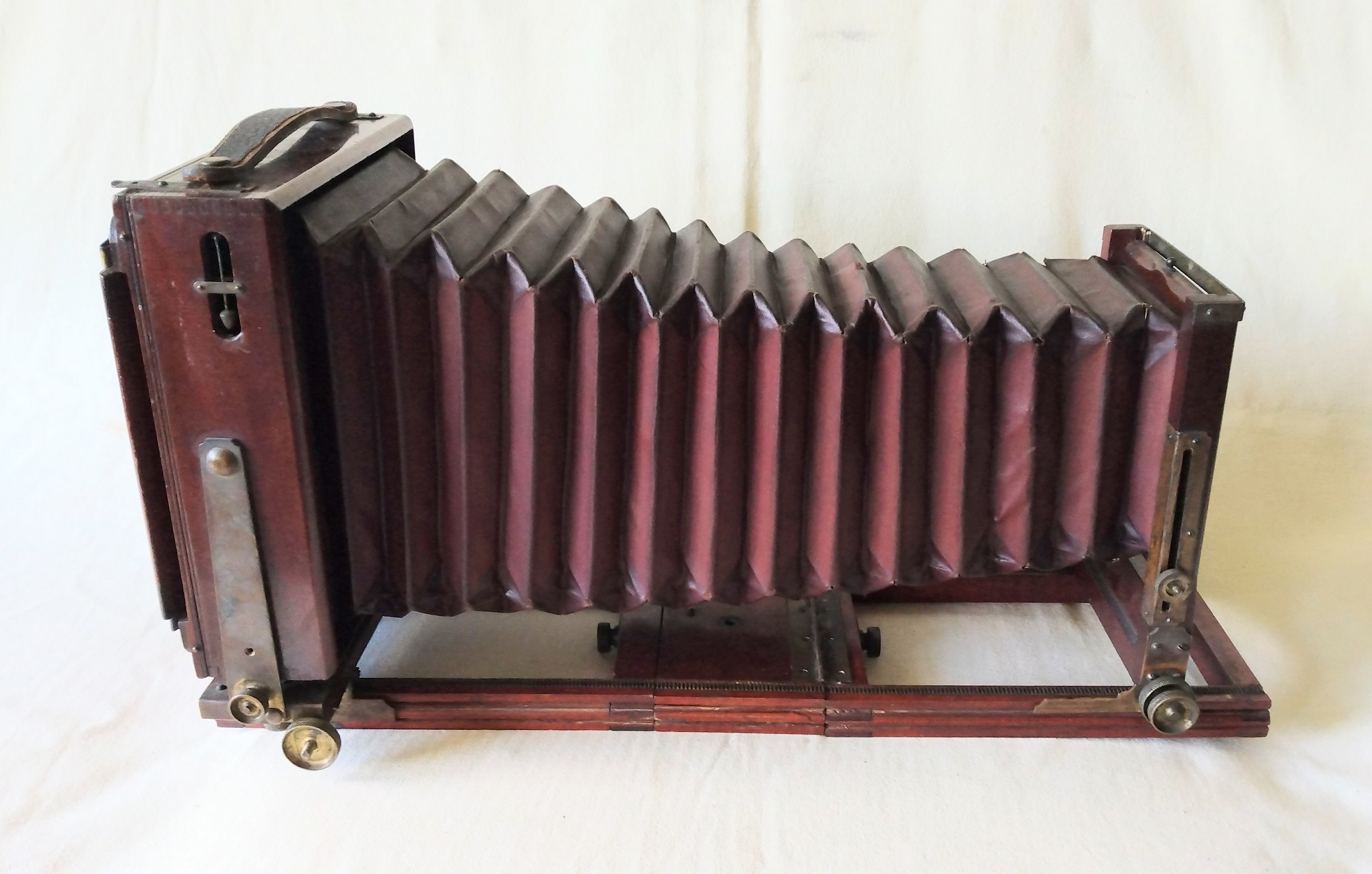 Materials: mahogany body; cherry base; black leatherette bellows; brass hardware, lacquer finish