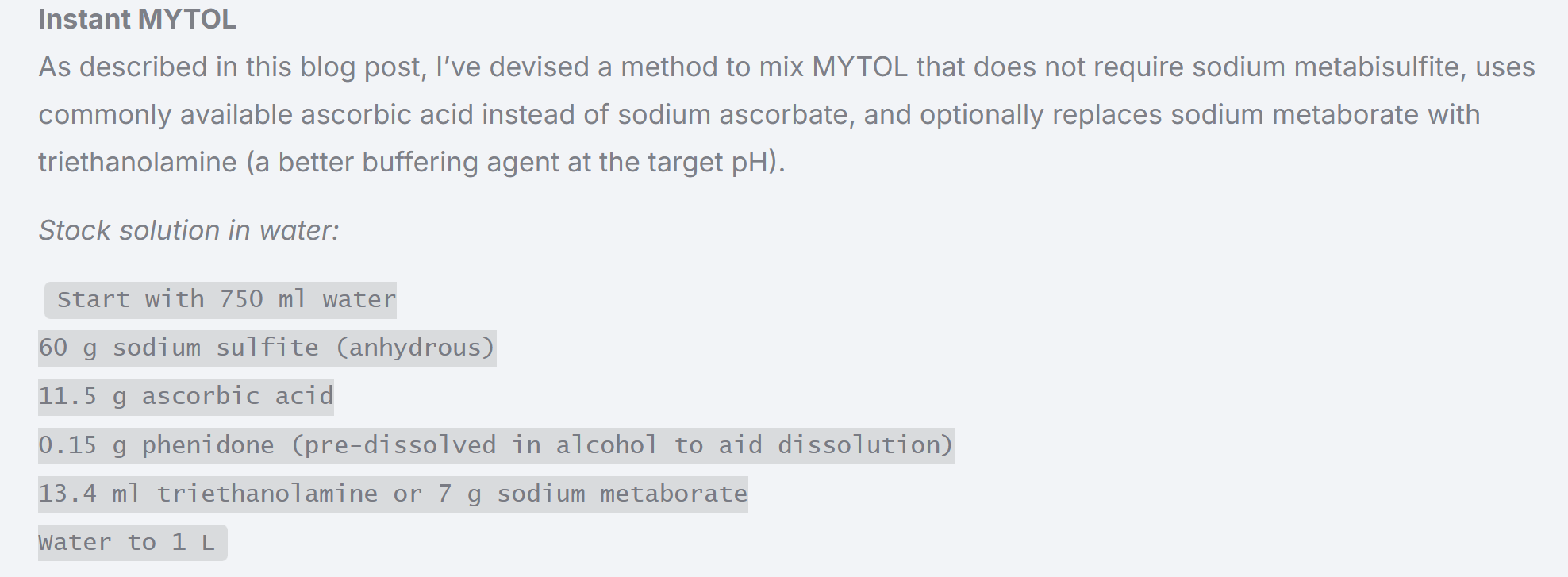 This is the Instant Mytol recipe that I have copied and pasted in a document from a few years ago. I've yet to try it, but will be soon, as my stock of XTol is down to one, 5L package. Once I'm out, then I'll start playing around with regular and instant Mytol...
