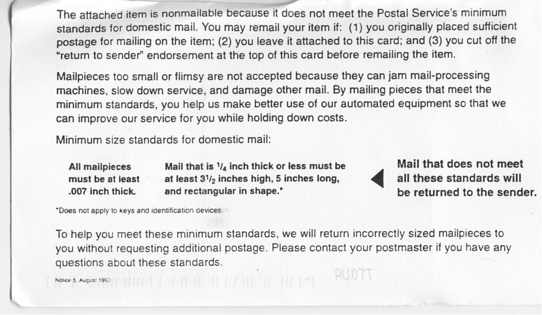 The post office added a greeting to the postcard, though... the Polaroid (600-type print) was taped to a card explaining the minimum standards for domestic mail. Uh-oh! Some of the prints I sent out were type 600. I hope they make it... I didn't put my return address on the prints. The card says that the post office returns to sender any mail that doesn't meet the standards. Interesting...