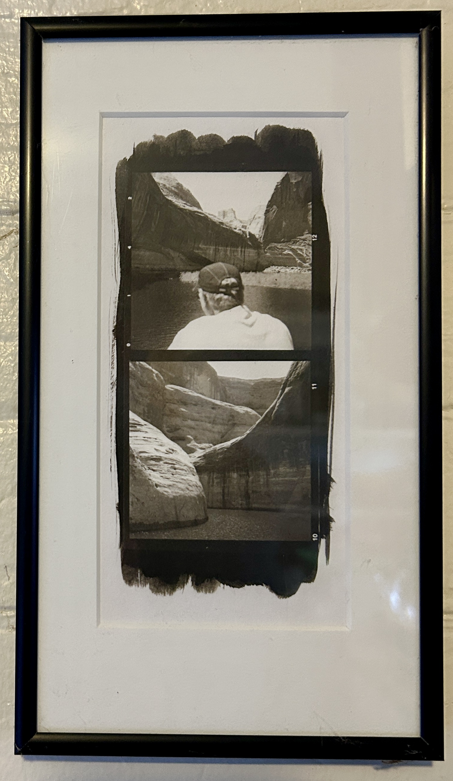 This is a quick iPhone image of a framed piece in my kitchen… two adjoining frames, pt/pd print. My brother-in-law on a boat on Lake Powell. Fun stuff.