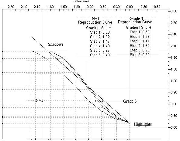 I've attached a tone reproduction curve example. This curve represents how the print value's relate to the original scene's. One curve represents a 1.80 LSLR scene processed Normal and printed on a higher grade of paper (grade 3). The other curve represents a 1.80 LSLR scene processed N+1 and printed on a normal grade of paper (grade 2). In the top right hand corner of the curve are the gradients for each step. The N+1 curve has higher gradients in the mid-tonal range and the Grade 3 curve has higher gradients in higher tones.