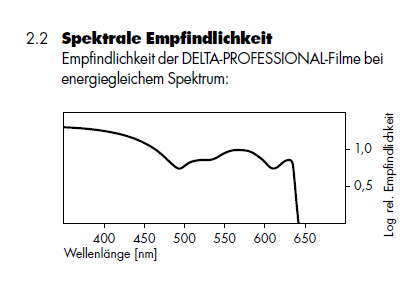 The attached spectral sensitivities are for Delta 100, published by Ilford ca. 1996. One from the german datasheet, one from the english.
