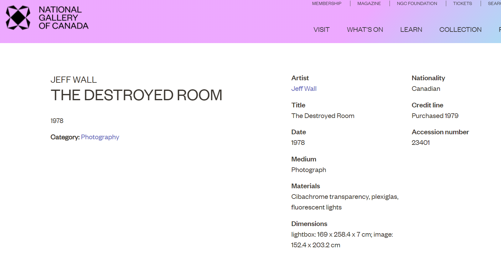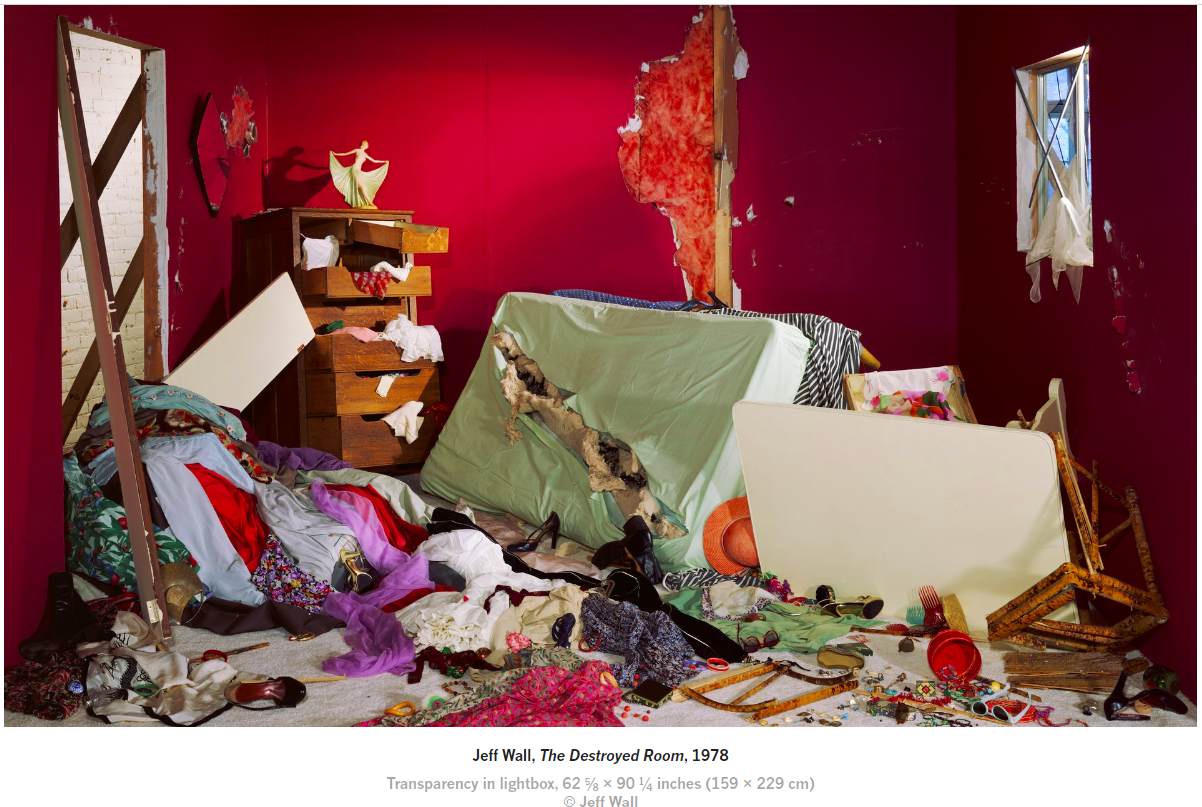 One example, chosen because the internet information lists materials. It is in the National Gallery of Canada's collection, the 1978 work "The Destroyed Room". Note the size.