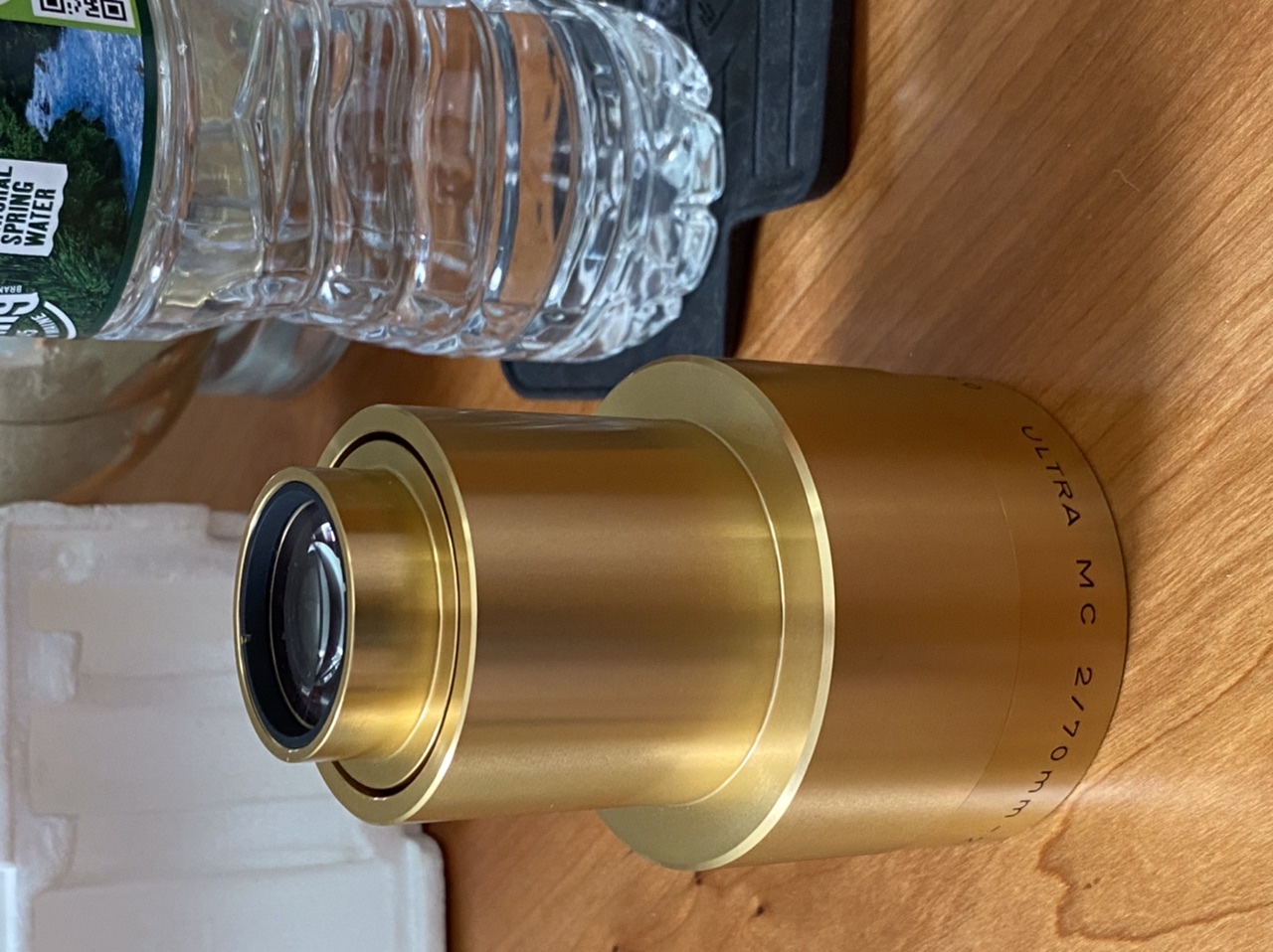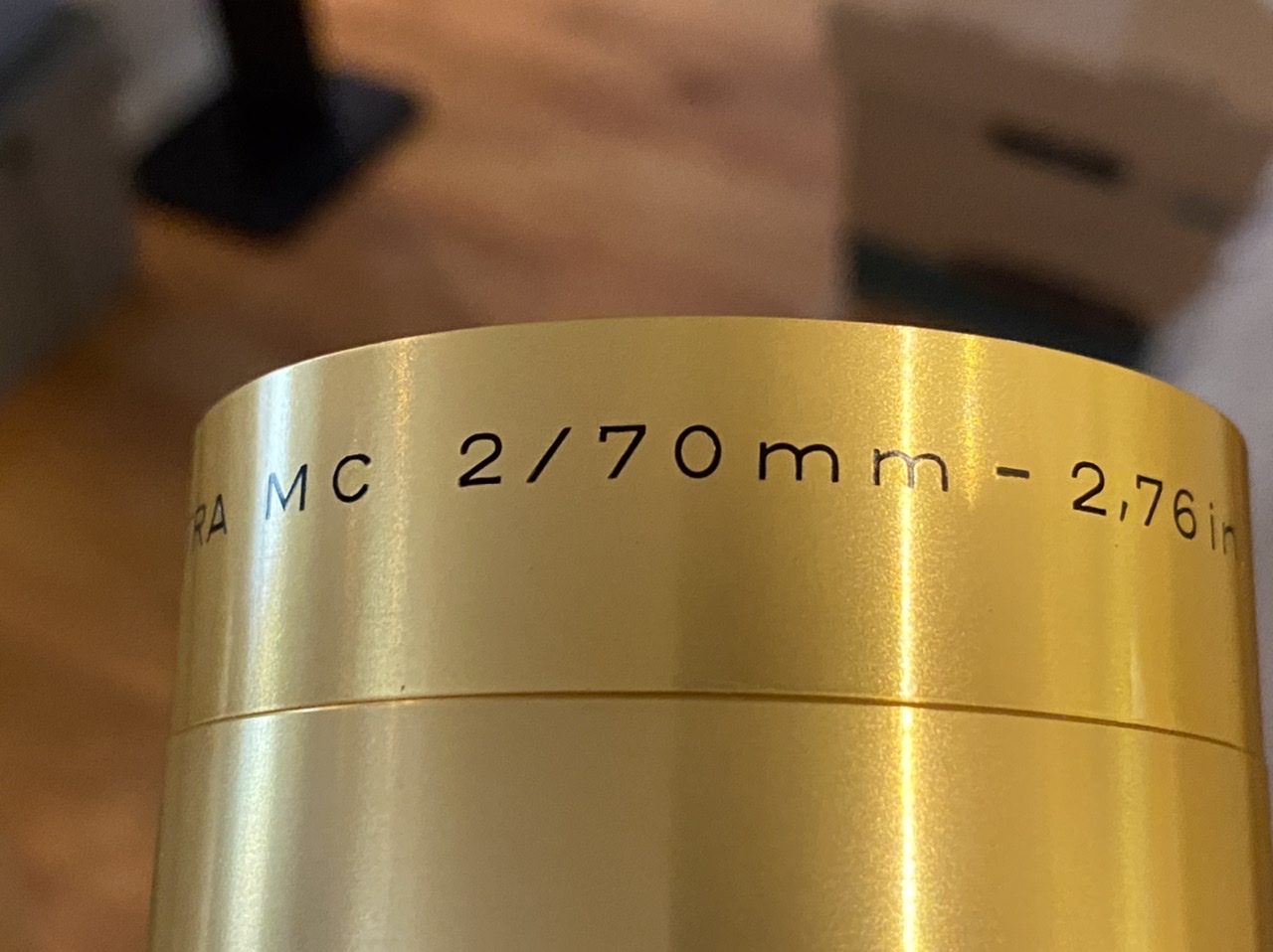 Large and lovely new old stock lens. 70 mm F/2. Image circle is not large. My guess is that it covers 35 mm film. Includes original box and intact Styrofoam packaging. Available in the northeastern US for $20 plus shipping. Enjoy!!
