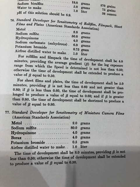 Nice find, thanks for posting it. No problem in using HC110 for a speed estimate though. IIRC the ISO standard doesn't require a specific developer for testing anyway. Any developer is ok and you actually get slightly different speed when using different developers.Interestingly enough, here are the developer formulas per the old ASA standard. This is out of Practical Photographic Chemistry by O’Hara & Osterburg.
