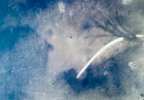 In-camera cyanotype, 16 oz. beverage can pinhole camera. New cyanotype chemistry (brush application, dried for two days) on 100% cotton deckle paper, 9hr. exposure.