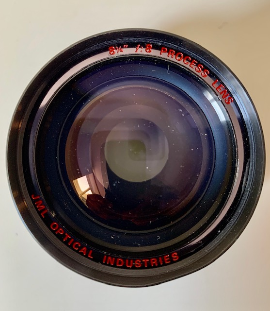 Selling a JML 8 1/4 inch F8 wide angle process lens with mounting flange. Glass is in good condition with a few cleaning marks and usual dust specks. Aperture blades open close smoothly and are oil free. Covers at least 8 x 10 and some say 10 x 12. A very sharp lens.