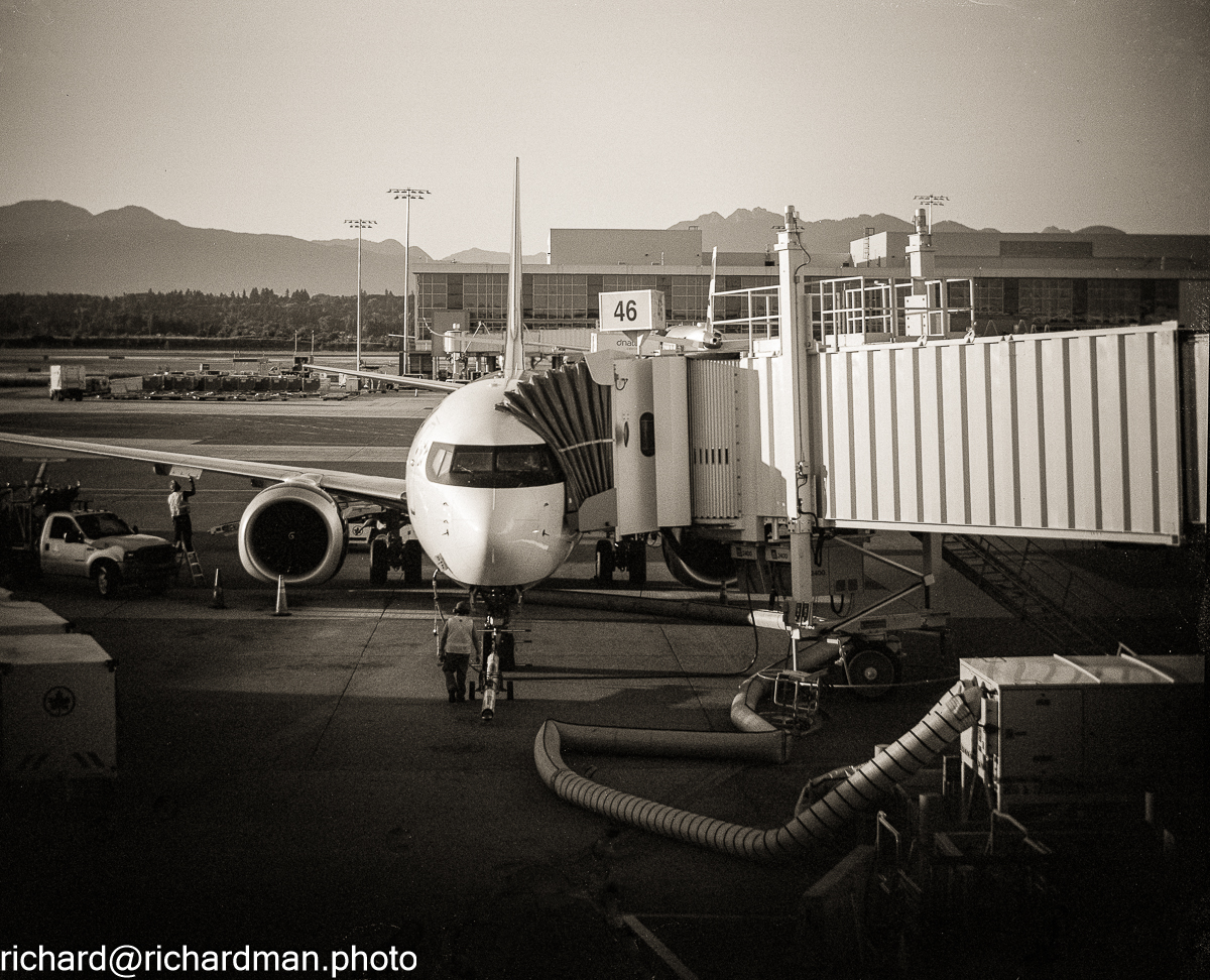Vancouver airport. We have been to YVR many times, including a couple times as the layover spot, but never did we have an 8 hours layover - until when we went to Winnipeg. So I took out my 4x5 and made a photograph. Gibellini 4x5 Cooke 1880s RVP.