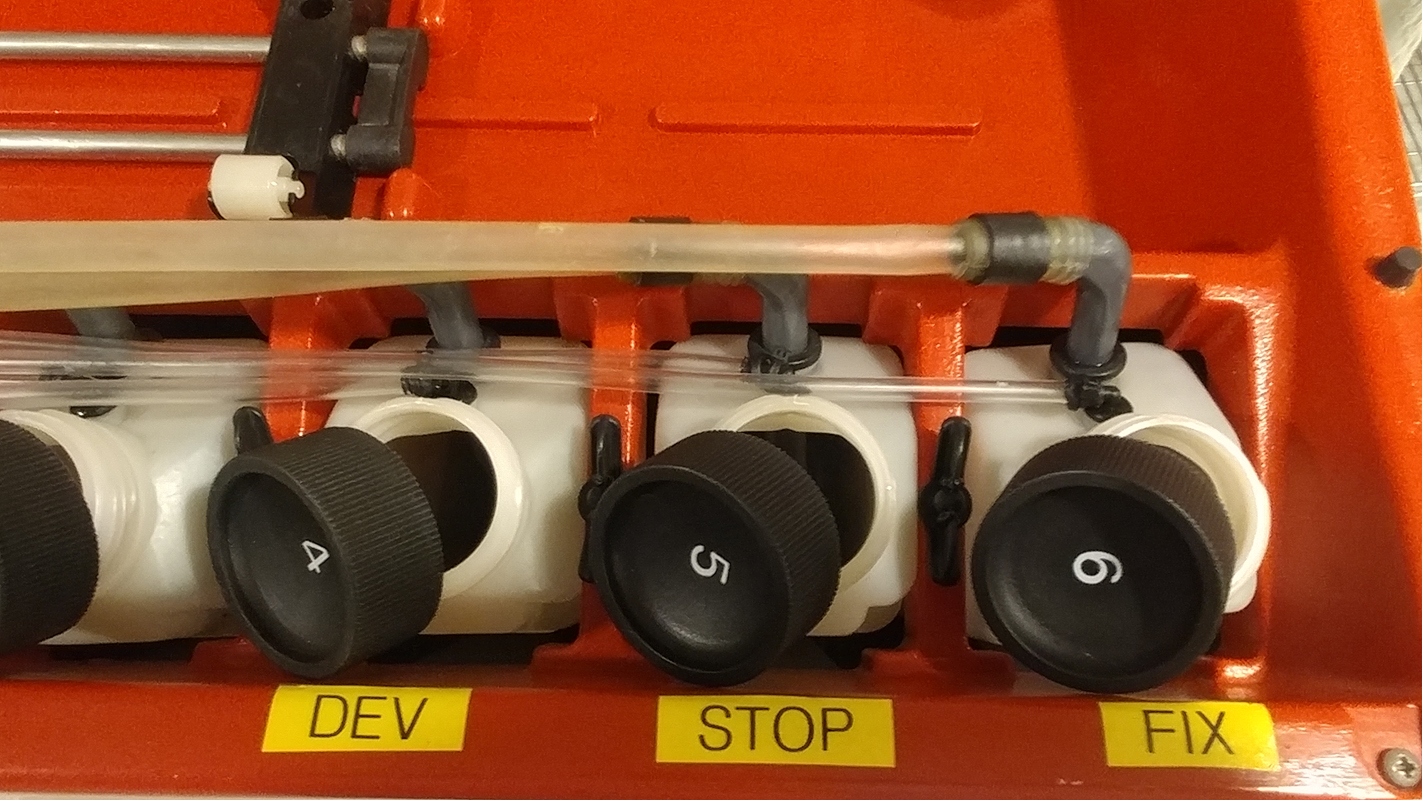 I'm to control the output nozzle with a servo. I replace all plastic tubes by silicone tubes, I place a pressure sensor just after the air pump to check pressurization in the active bottle, this would diagnose pressurization an lack of liquid. I also place a flow meter for the rinse water.