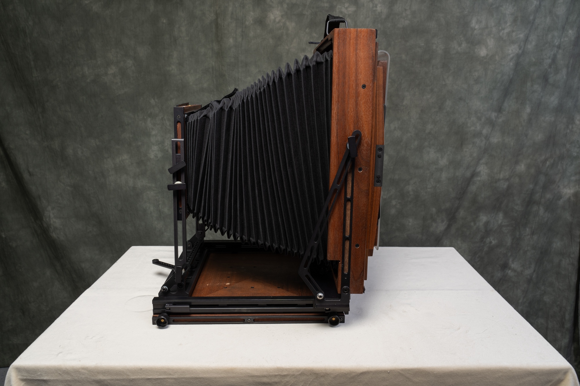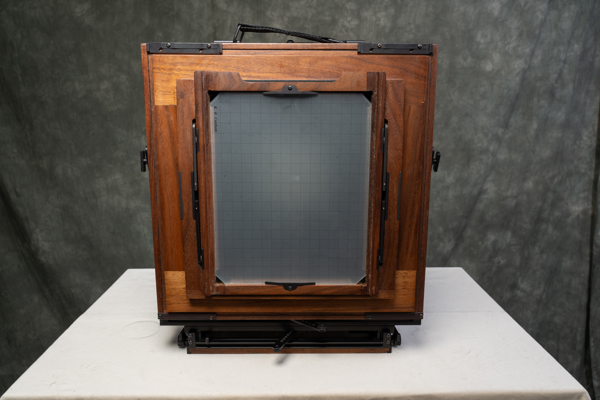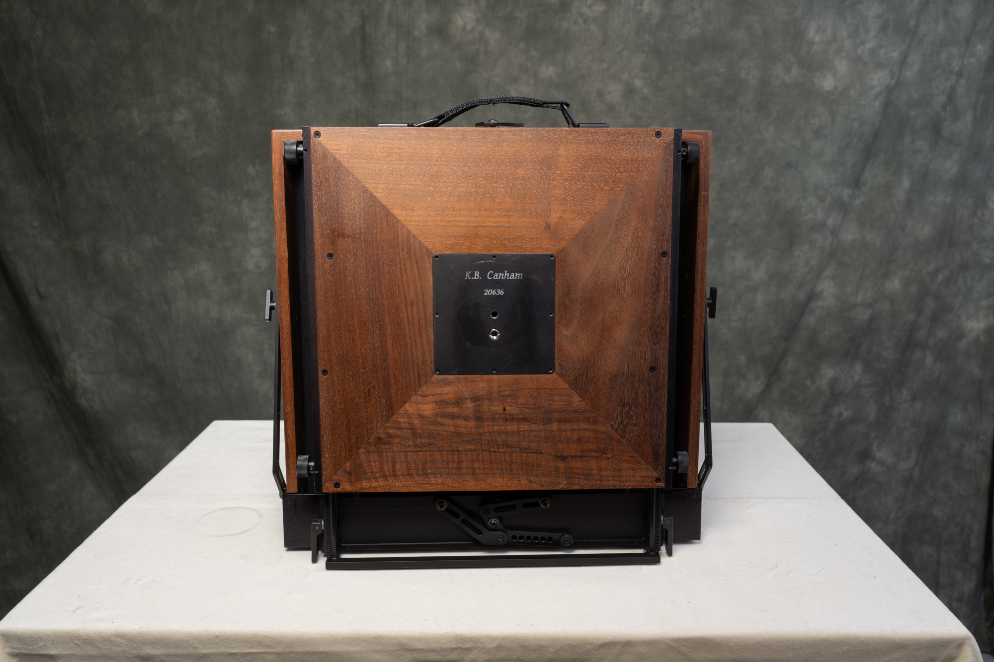 Up for sale is a fairly unique Keith Canham 10x12 camera. This is built on Keith's 8x10 frame so it can take a conversion back and bellows for 8x10 or 7x17, although this camera includes reducing backs for 8x10 (as seen in the photos here) and 5x7. I can provide photos of the 10x12 and 5x7 backs upon request. Other specs are standard for Keith's products: the rear standard has a significant amount of shift available, swing is available on both standards, and tilt is available on both standards with both base and axis tilt on the front.
