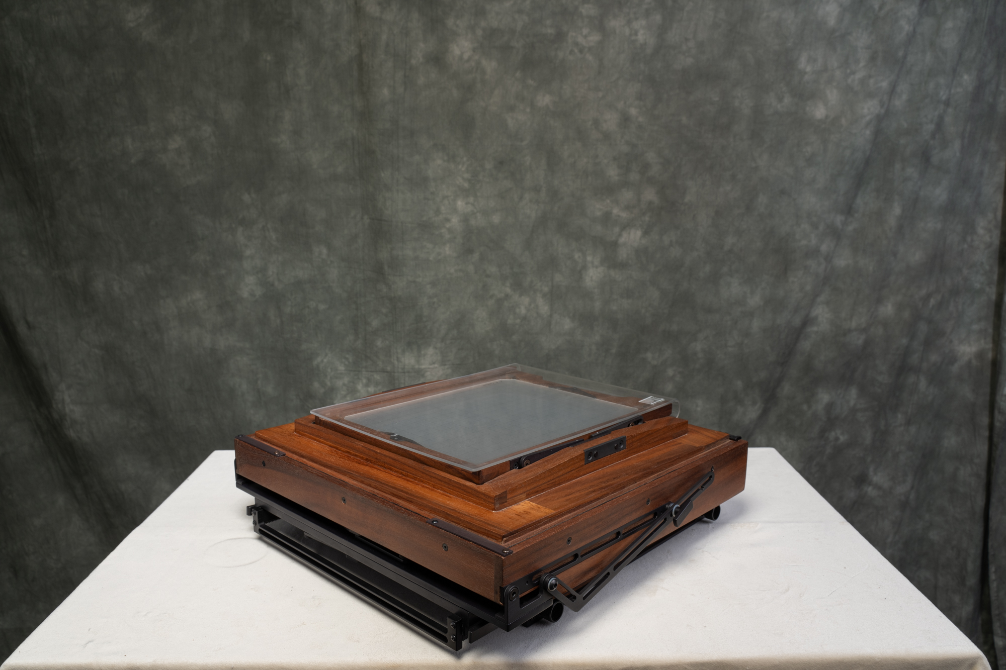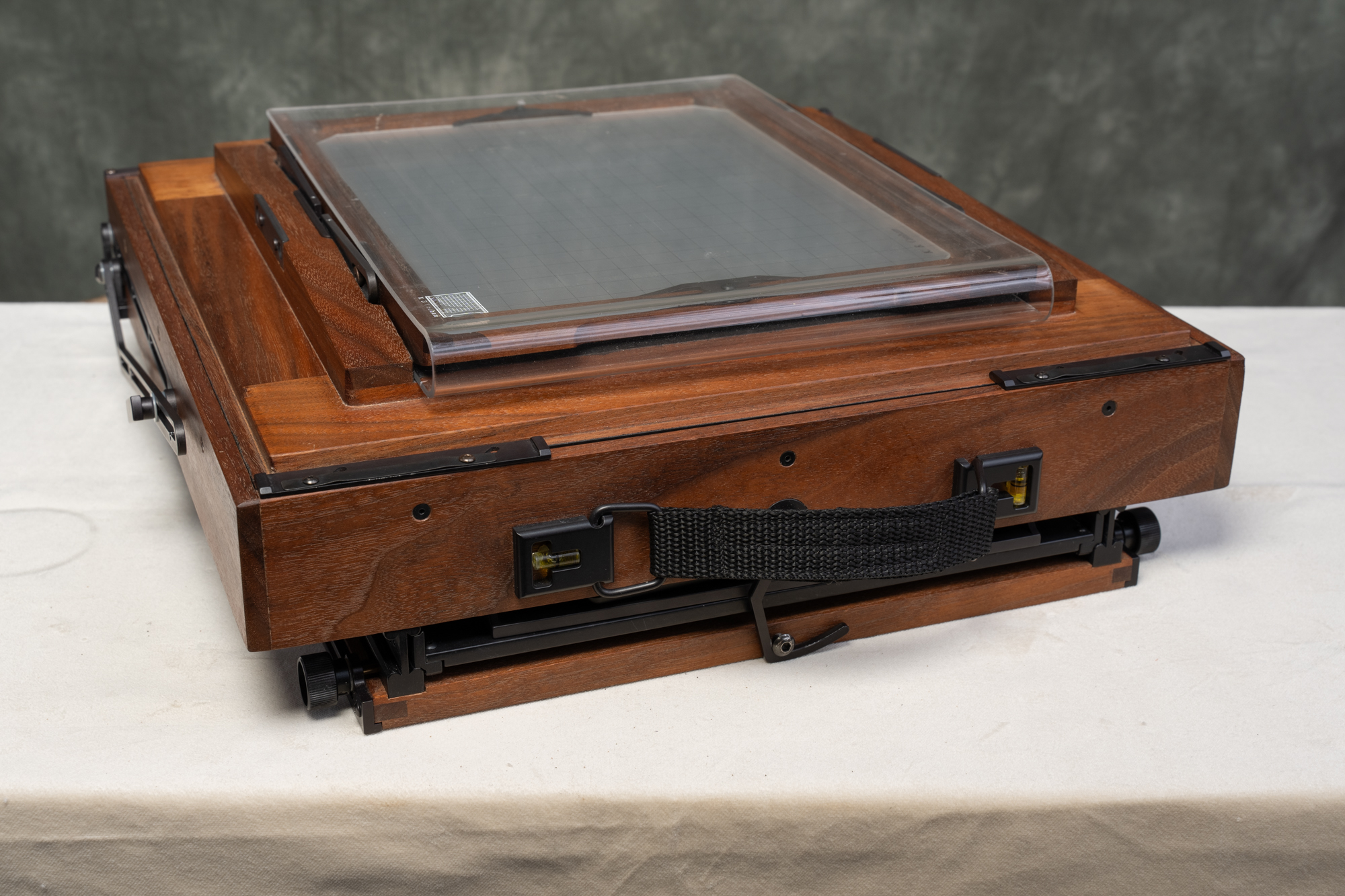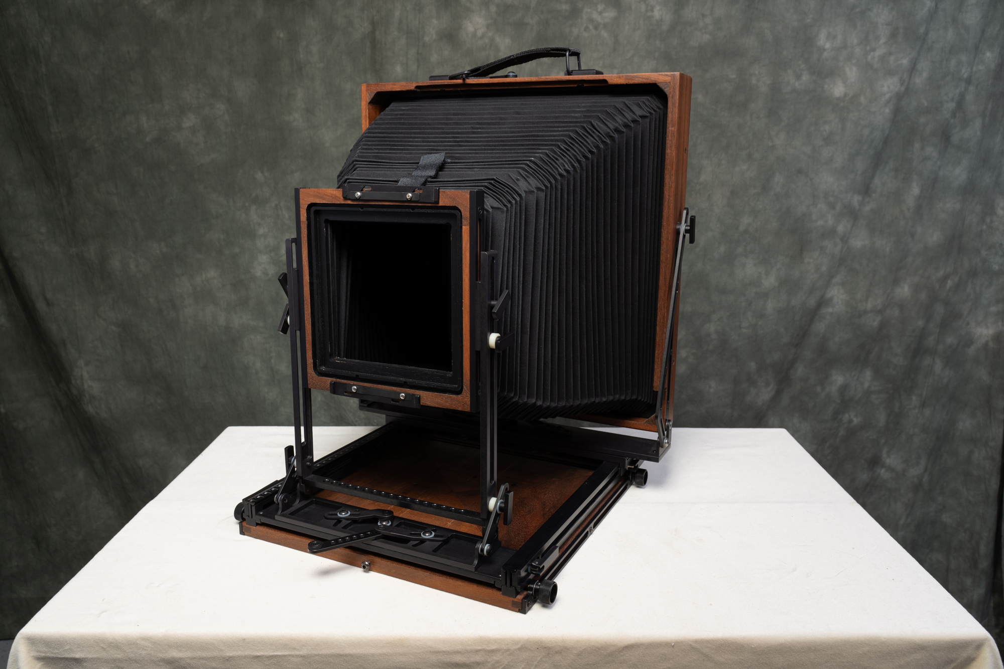 Up for sale is a fairly unique Keith Canham 10x12 camera. This is built on Keith's 8x10 frame so it can take a conversion back and bellows for 8x10 or 7x17, although this camera includes reducing backs for 8x10 (as seen in the photos here) and 5x7. I can provide photos of the 10x12 and 5x7 backs upon request. Other specs are standard for Keith's products: the rear standard has a significant amount of shift available, swing is available on both standards, and tilt is available on both standards with both base and axis tilt on the front.