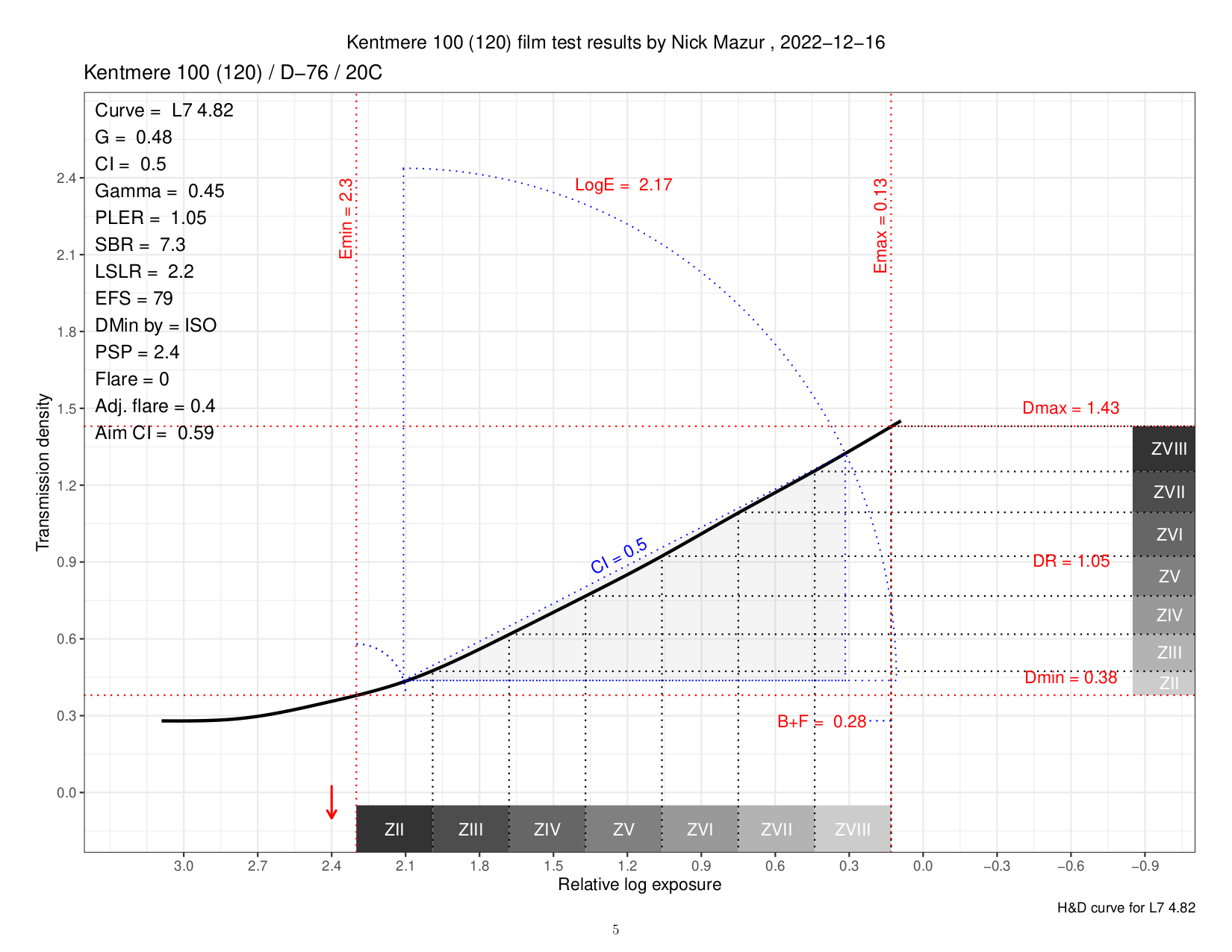 I have a couple of curves that simulate capturing the "normal" subject luminance range of about 7.3 stops (or LSLR = 2.2) for people who are interested in photographing such scenes. These are hypothetical curves based on the curve families for Kentmere 100 and Kentmere 400, respectively. The parameters of interest are listed in the left upper corner of each plot. Flare-corrected CI is listed as "Aim CI."