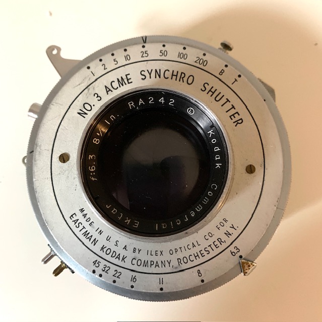 Selling an 8 1/2 inch Commercial Ektar F6.3 lens in Ilex 3 shutter with mounting flange. Shutter fires on all speeds including T and B and aperture and shutter blades open and close smoothly and are oil free. Glass in good shape with some cleaning wisps and the usual dust specks. Covers 5x7 with movements and some say will cover 8x10 when stopped down. Classic old lens.