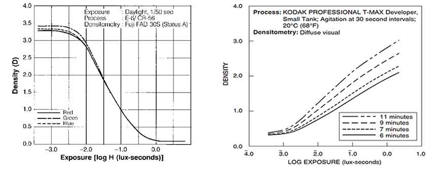 the slope of slides and negatives is different as far as I'm concerned. Here is direct comparison of provia against tri-x. the kodak trix chart has been scaled to match the spacing of the provia. ie the spacing of density and exposure show the same size grid and values. Clearly the tri-x gives a much shallowr curve than the provia. You can take the range of exposure across the straight line portion of both curves and divide it into the density range that the exposure range covers and get the films Contrast index.