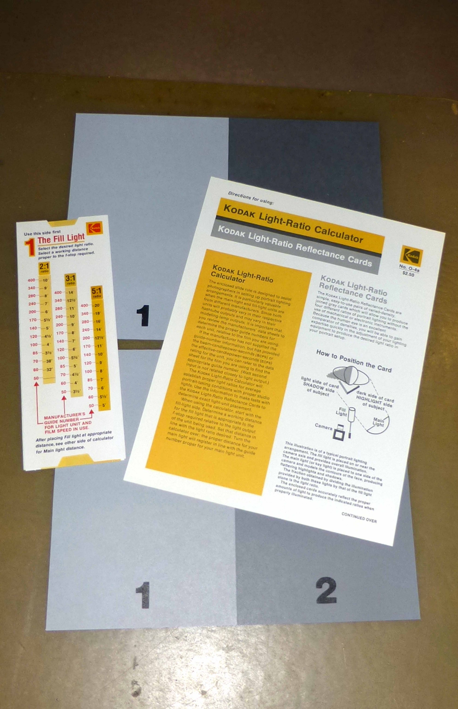 The Kodak Light-Ratio Reflectance Cards are simple, Easy-to-Use pairs of varied-density, joined gray cards which will allow you to produce 4 different ratios of portrait lighting without the use of mechanical or electronic instruments.