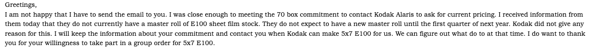 Somewhere, possibly in this thread, I've seen a reference to KB Canham having got together enough orders for 5x7 Ektachrome, but having to wait for several months because all the master rolls of Ektachrome scheduled for manufacture are spoken for until then.