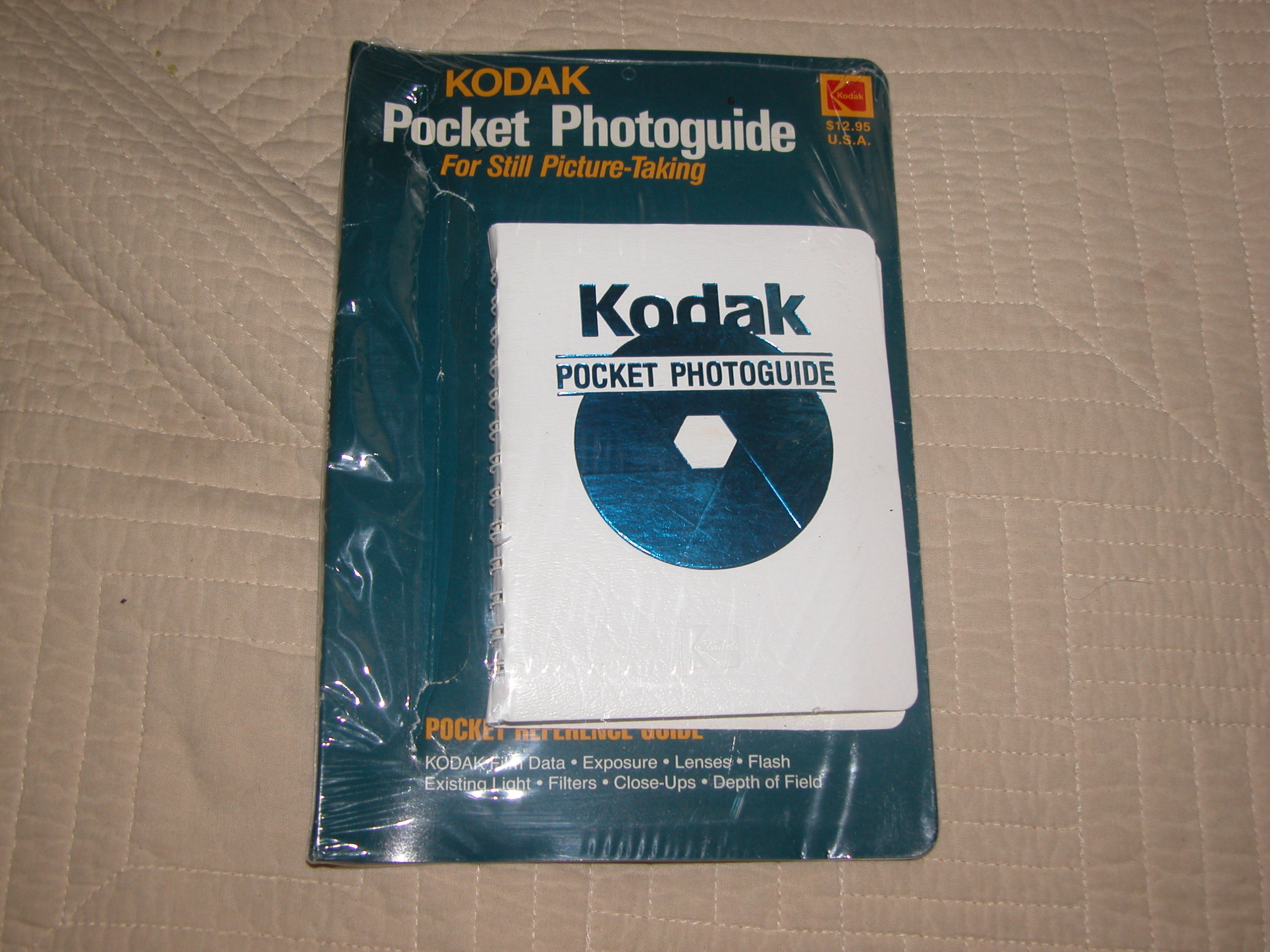 New, I removed from shirk-warp to photograph it. This is a super handy pocket book with dial calculators that serve as a guide to determine exposure, color balance and other picture taking settings. Included are a “sunny 16 calculator for outdoor-exposure, fill-in flash, Light balancing filters, B&W filter factors, Existing Light Calculator for difficult lighting, Electronic Flash exposure, Depth of field calculator for 35mm and 6x4.5,
