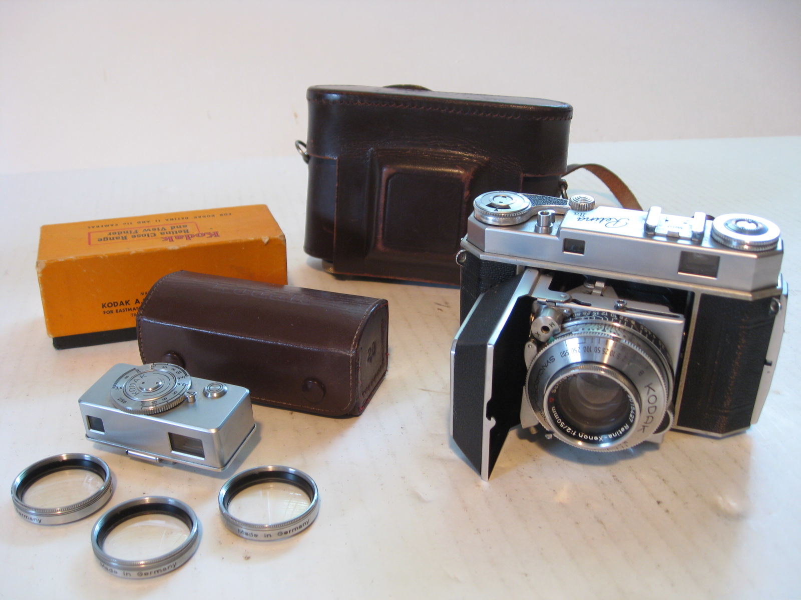 DESCRIPTION: Kodak Retina IIa Rangefinder Camera, Xenon 50mm f2 Lens, Case & Close Range Set & Viewfinder. Includes leather case. As shown.