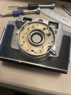 In my experience you don't have to remove the shutter housing from the focusing helical in order to service it. If you get as far as the photo in post #6, you can go ahead and remove the mechanism plate from the shutter housing by removing its fastening screws and lifting it out. The one catch you will find is that the cocking lever and its ring are in the way. I believe originally Kodak would have punched out the knob on the cocking lever, removed the lever and then lifted out the mechanism plate.