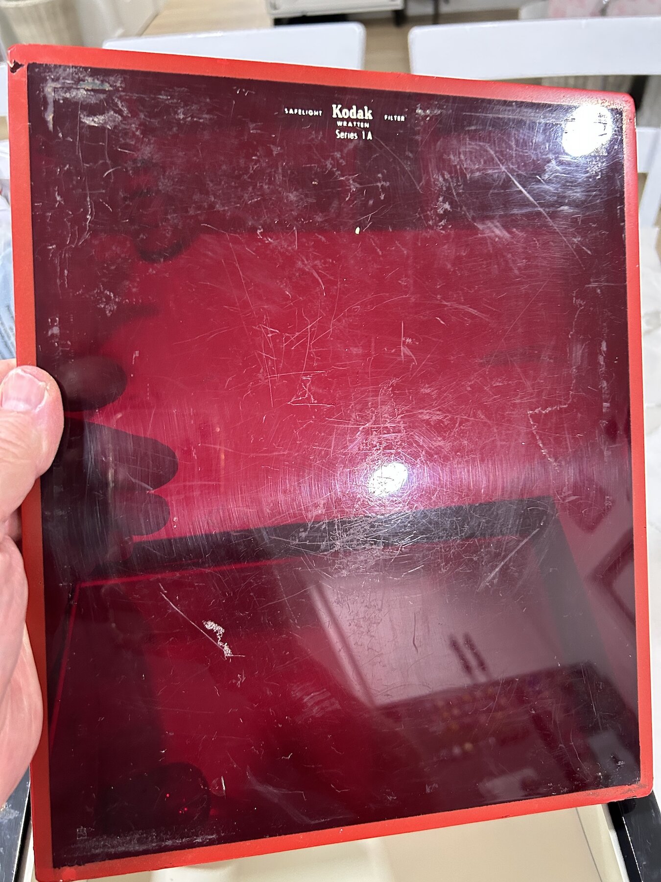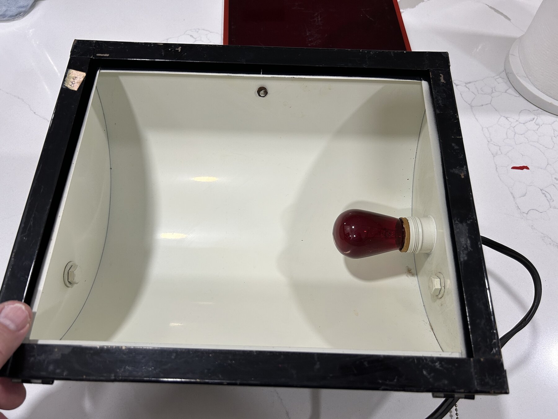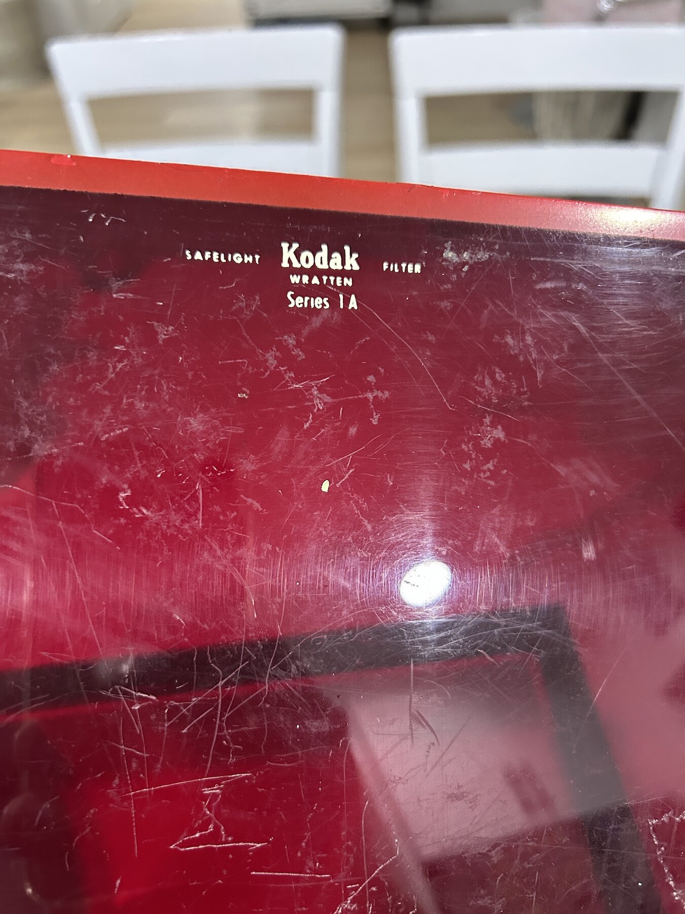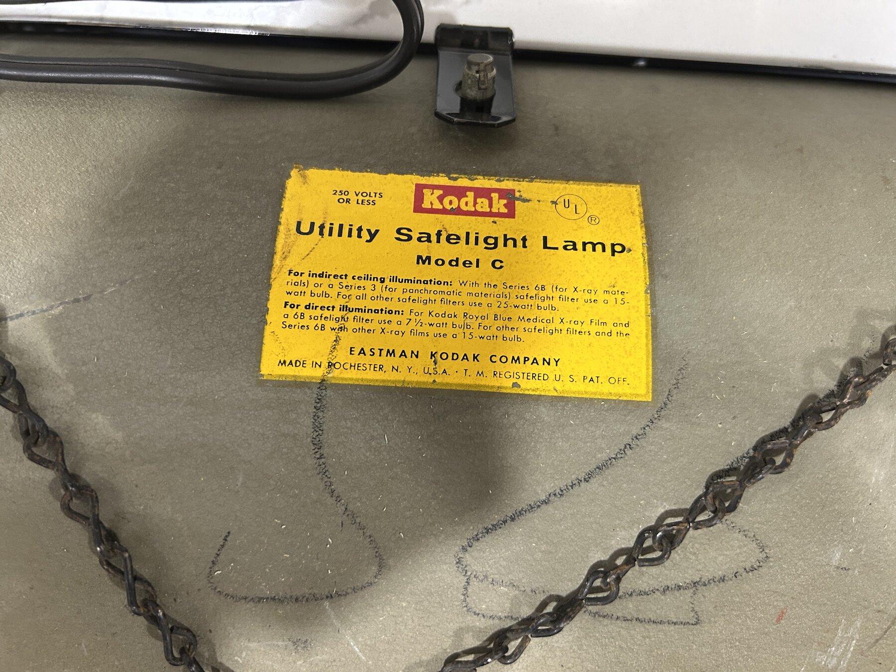 I am selling a used Kodak Utility Safelight Model C. Included is a huge Kodak Wratten 1A filter that fits on to it. This is a very large safelight designed to illuminate larger darkrooms, and is typically deployed from the ceiling using a hanging chain (included). This safelight has seen a lot of use over the years, but still works great. Sold as shown.