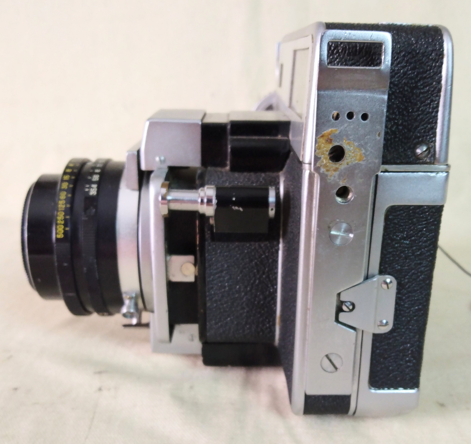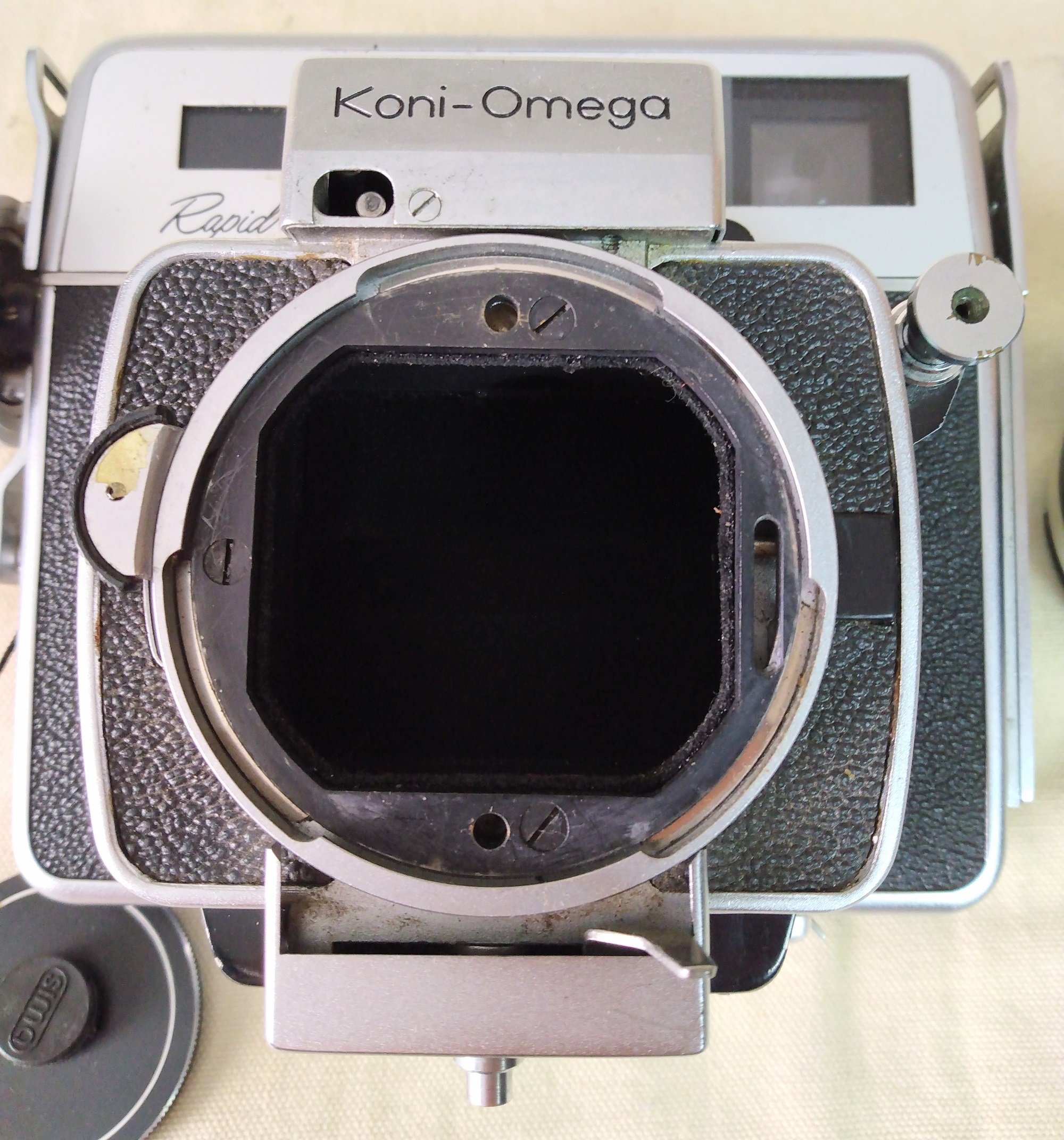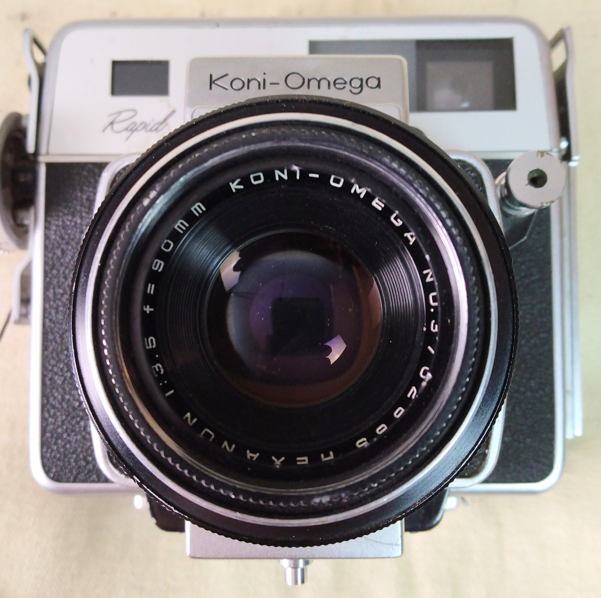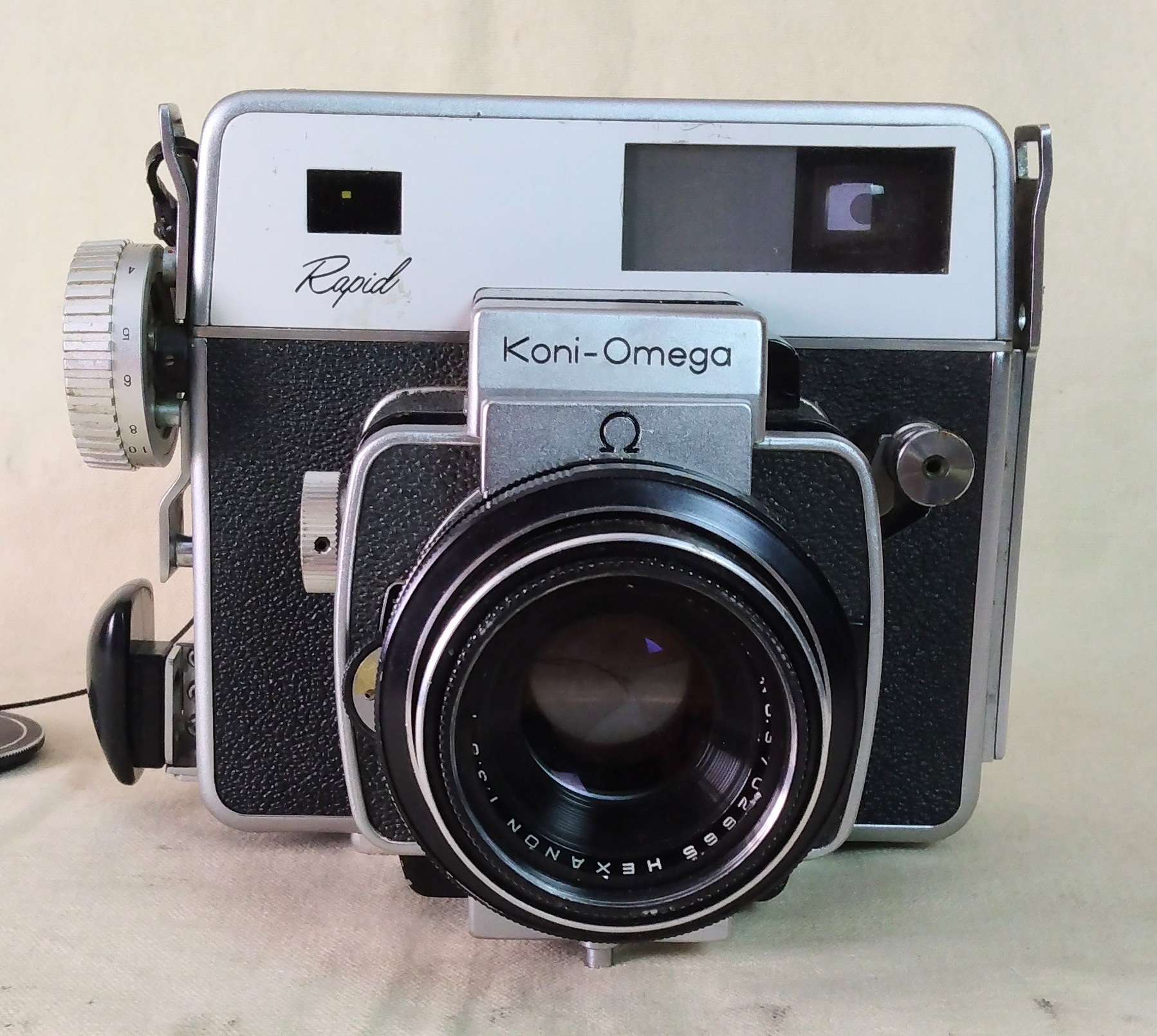 Koni-Omega Rapid, a medium format rangefinder press camera that shoots 6cm x 7cm images on 120 and 220 roll film. The camera gets it’s name from it’s unique rapid film advance lever, which when pulled out and pushed back, rapidly advances film and readies the shutter for the next exposure.