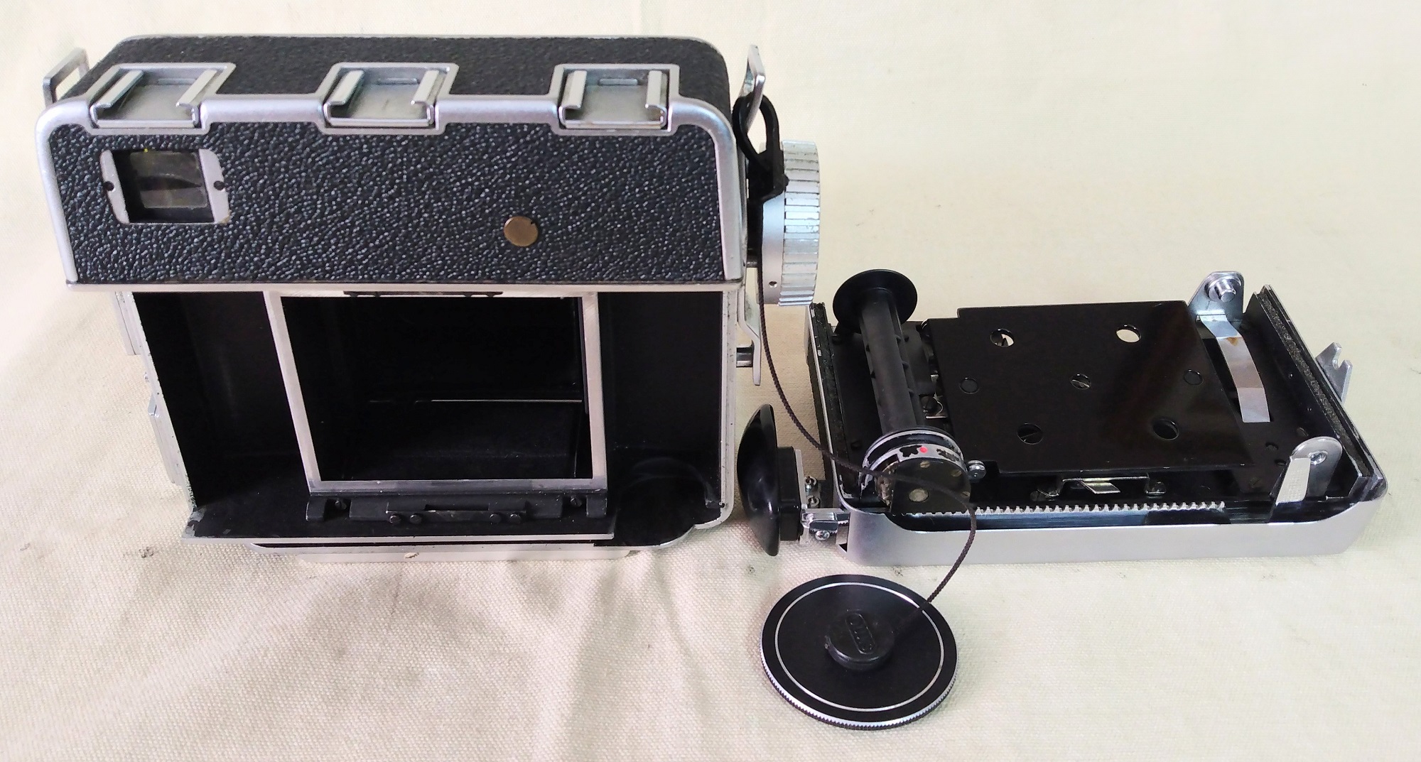 This is an earlier model of the Koni-Omega Rapid, and does NOT use a removeable dark slide to change the lens. I've owned some of the later models, and misplacing or losing the removeable dark slide was always a risk. Rotating the knob on the right side (just behind the lens) to the closed position (necessary to remove the lens) will prevent the shutter from firing, so a nice safety measure to have.