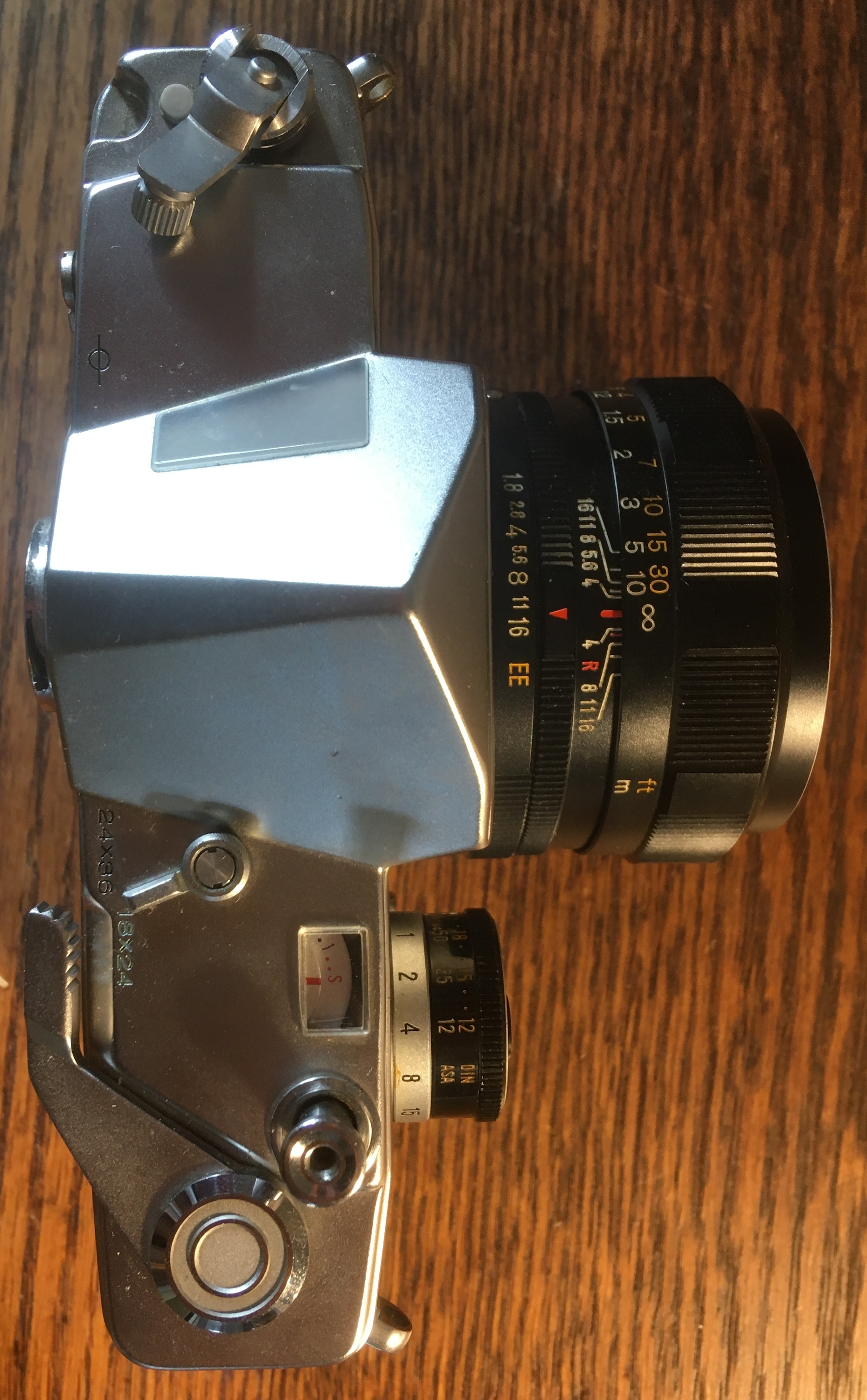 Selling a 35mm Konica Auto-Reflex. This one is labelled "Revue", which I believe was for the German market. It's the same camera as the Autorex, and is notable for its ability to shoot both full-frame and half-frame, and change formats mid-roll. There's a selector switch on the top plate for frame size. The lens is the standard Konica 52mm f1.8.