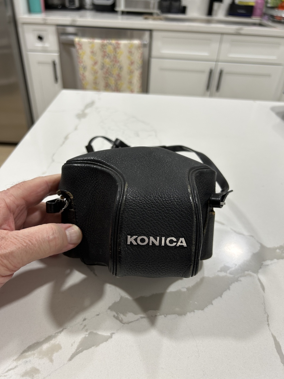 Sold as show with a slightly worn, but still nicely made Konica leather case and strap.