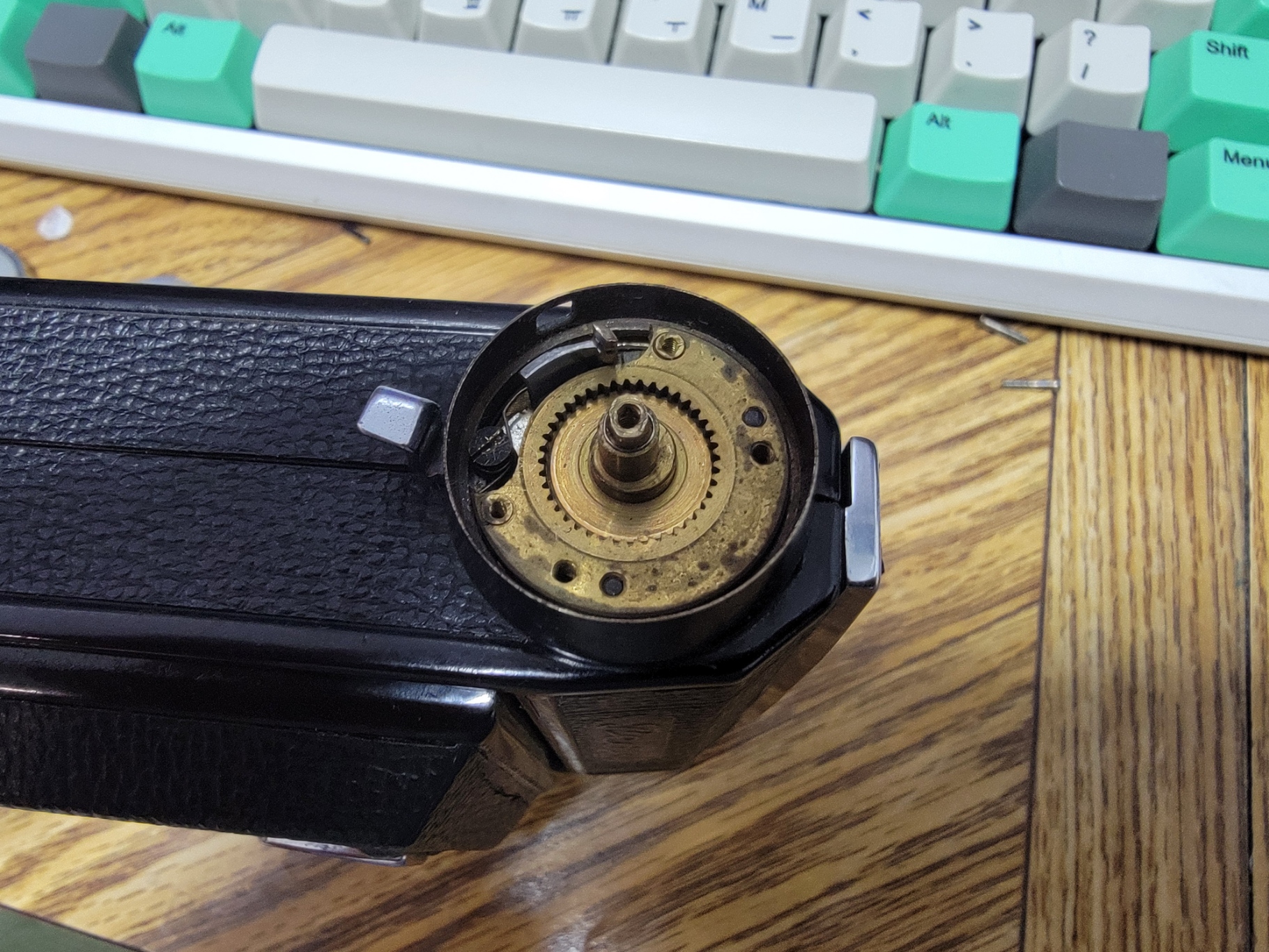 I half filled my mechanism with oil. It felt rough and gritty, yet the camera looks like it's never been used. I assumed the film advance and indexing would be smooth to operate, but that wasn't the case, it felt like I was stirring a bucket of dry rusty bolts. Hence all the oil I poured in similar to filling a car sump. Didn't reduce the grittiness though, but at least everything is getting well lubricated. Strangely, no oil has leaked out yet.