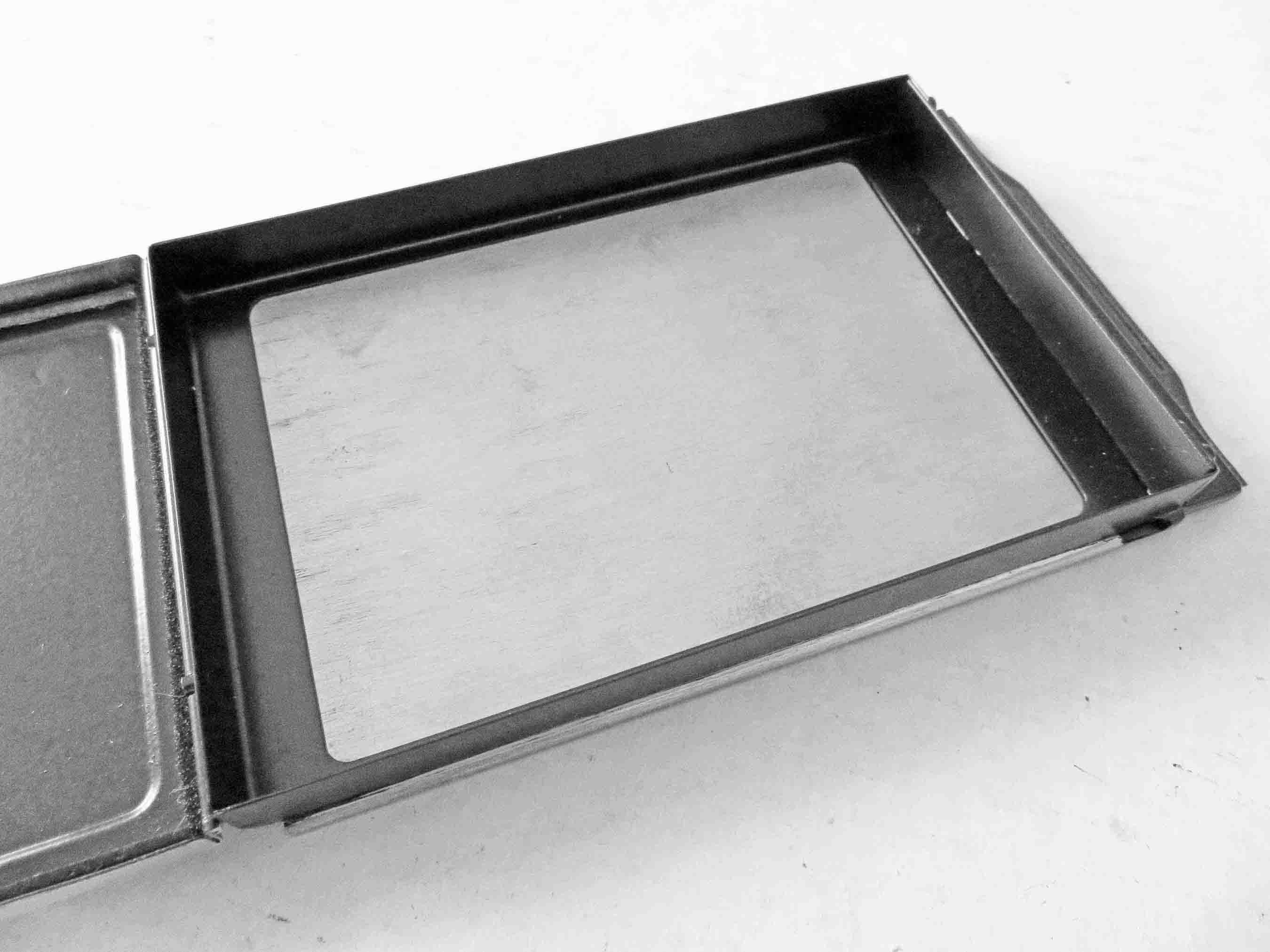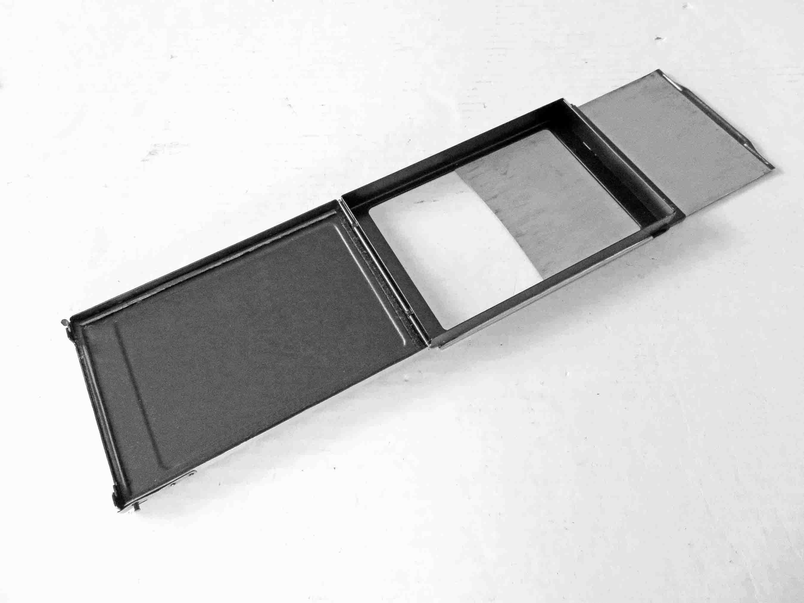 I recently got a 1931-35 KW Patent-Etui 9x12 glass plate camera. It has the focusing screen but had no plate holder. I purchased one recently but when it arrived I noticed that is has no pressure plate to keep the glass flush against the focal plane. I also noticed that the opening for exposure when the dark slide is removed is 86mm x 121mm. Isn't the glass plate 90mm x 120mm? That means that the hole is longer than the plate. Anybody know what is going on? I have included 4 photos to illustrate the issue.