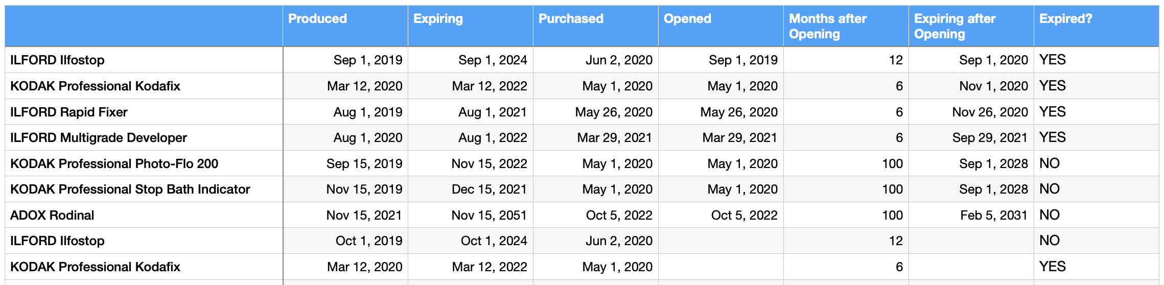 I made this table with the chemistry I currently have. I couldn't find info for Kodak Photo-flo and Indicator Stop Bath, but I read they can be stored for a really long time, so I put 100 months, just for the formula.
