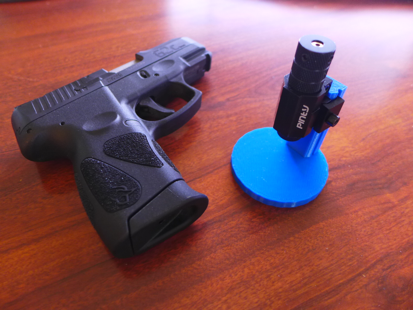 3) Go to Amazon and buy a cheap laser that mounts to a picatinny rail (for guns). I bought the "Pinty Compact Tactical Red Laser Sight" for $15. I am telling you which one I bought because I know it mounts and, once mounted, it appears to be dead center in the stand, which helps when aligning the laser. You can buy any cheap laser you want.