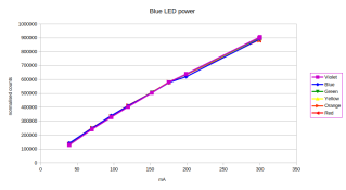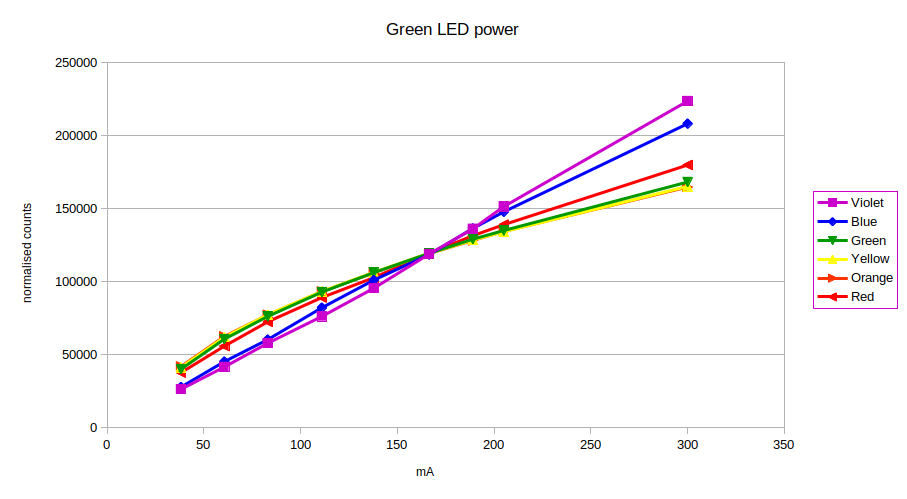 The green/yellow channels show a rapid fall off in efficiency, while the blue/violet grow almost linearly. By 300mA (circa 1W) the blue output exceeds the green output (in absolute count)