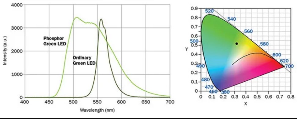 It corresponds more closely to a phosphor than a true green. note the shift towards the blue