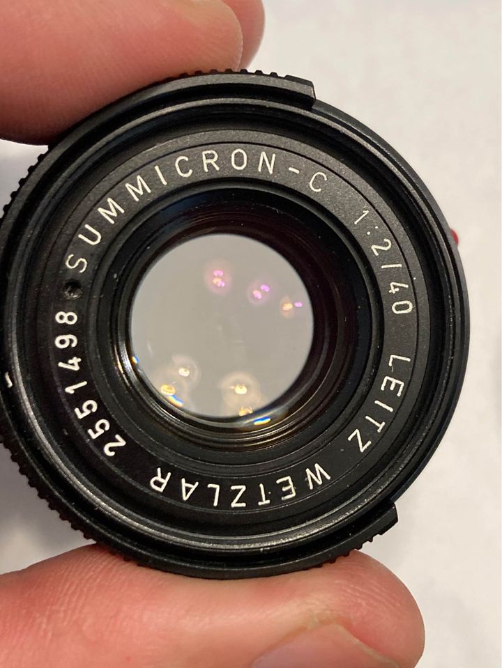 Leica Summicron 40/2. Just back from Youxin Ye where this lens had a CLA. Glass is in great shape with no fungus, haze or oil on the blades. Two or three tiny cleaning marks otherwise glass is very nice. Shoots great. See pics I just took. Quite sharp stopped down. Nice bokeh at f/2. Would grade lens 9- condition.