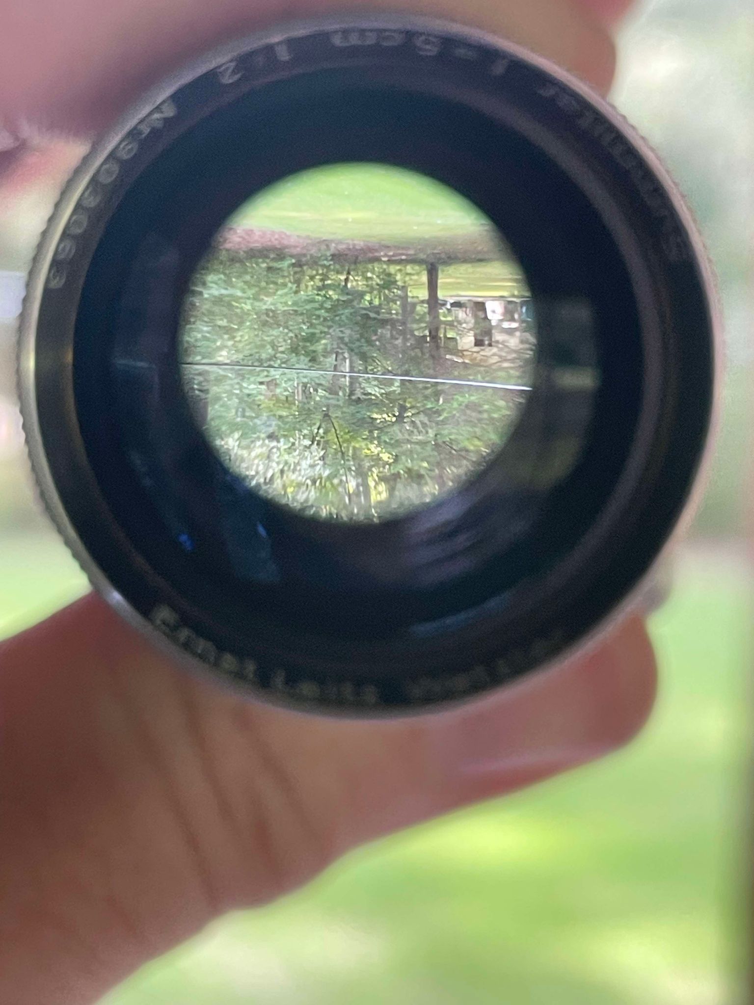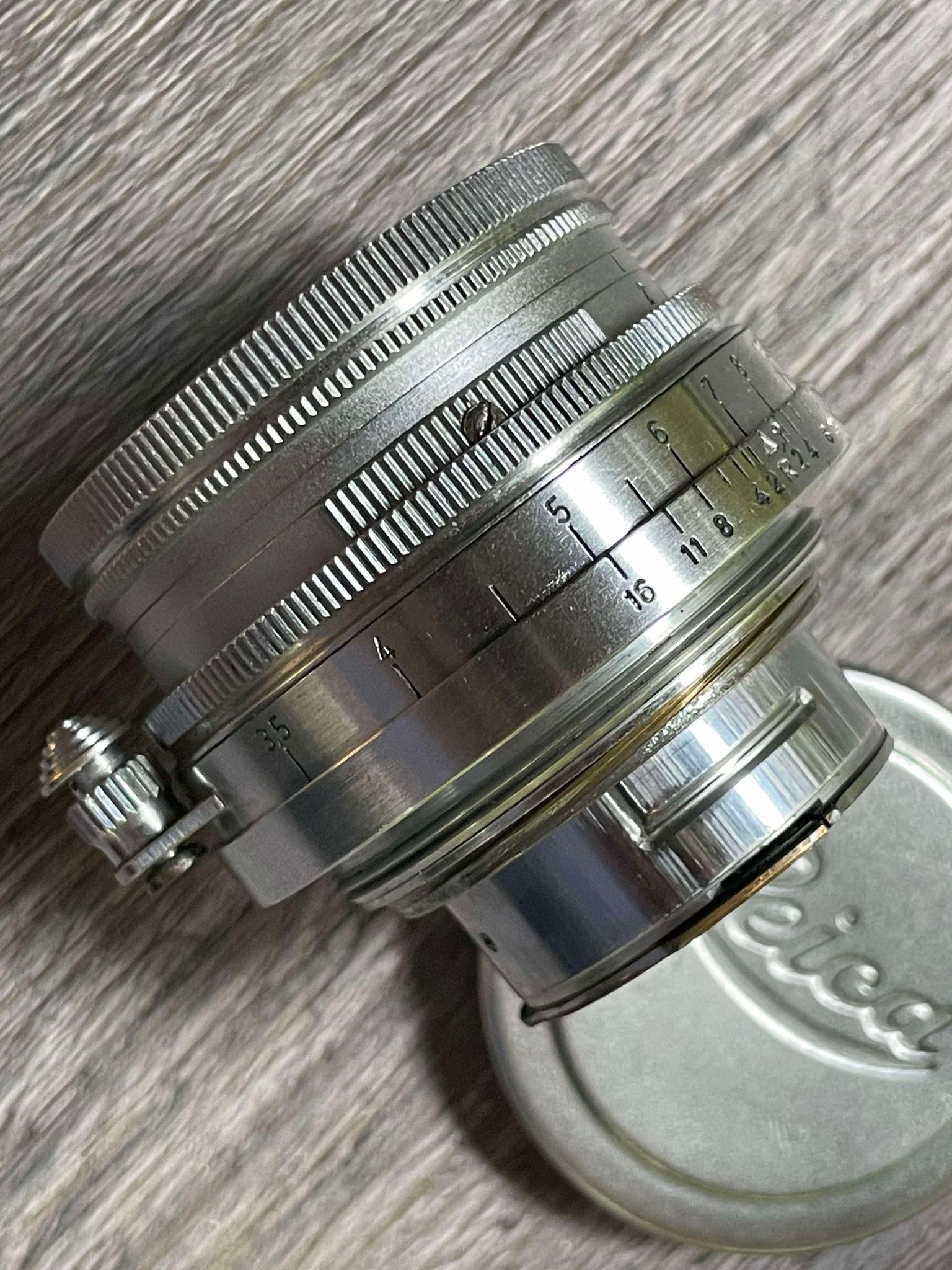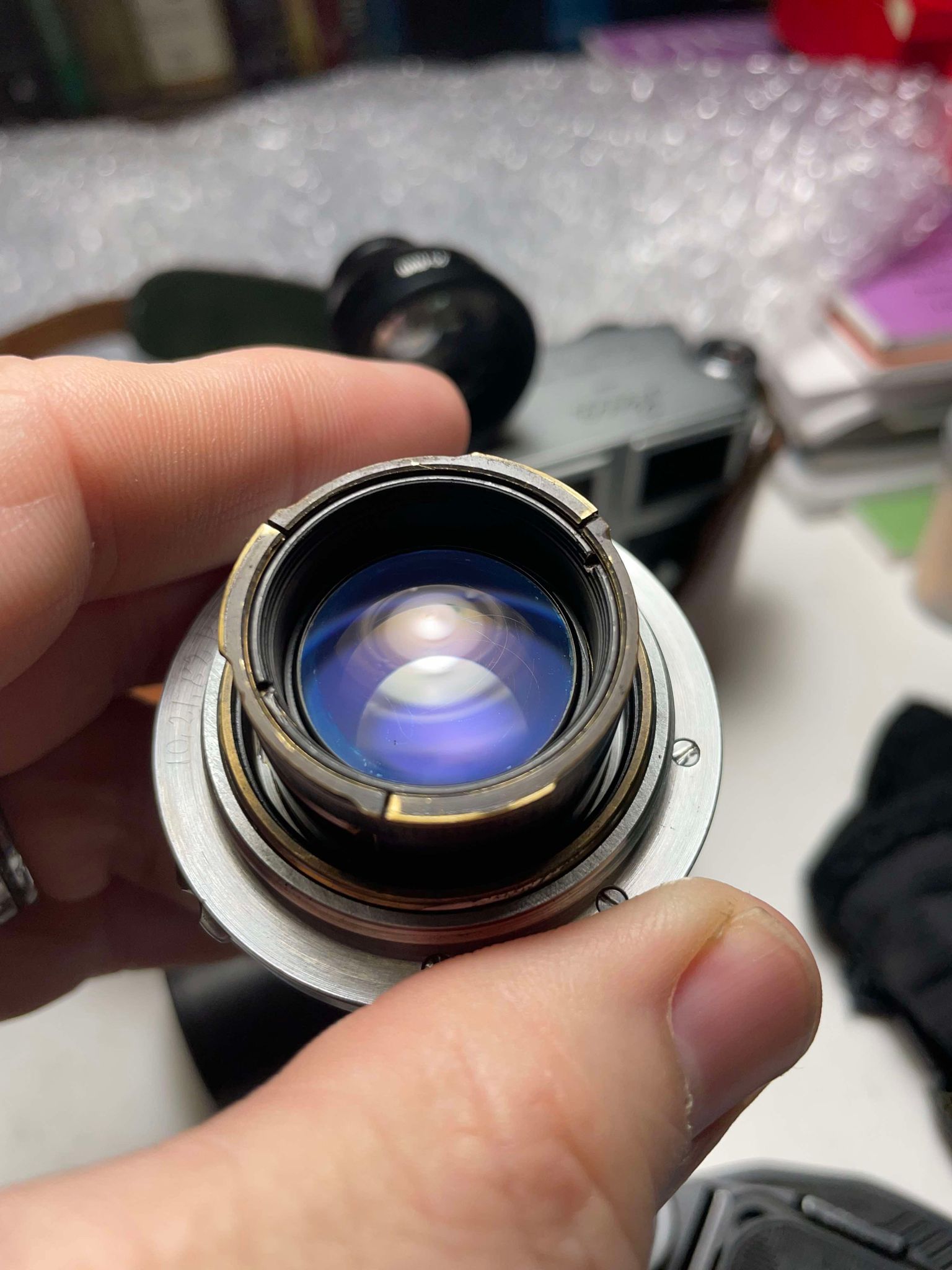 His notes: "Cleaned, and lubricated both aperture and focus rings. Touched up missing paint on element edges. Cleaned each element in the lens and removed haze inside. The lens is clean and clear now considering its age. Tested the lens with digital M body, lens is in focus and produces good images."